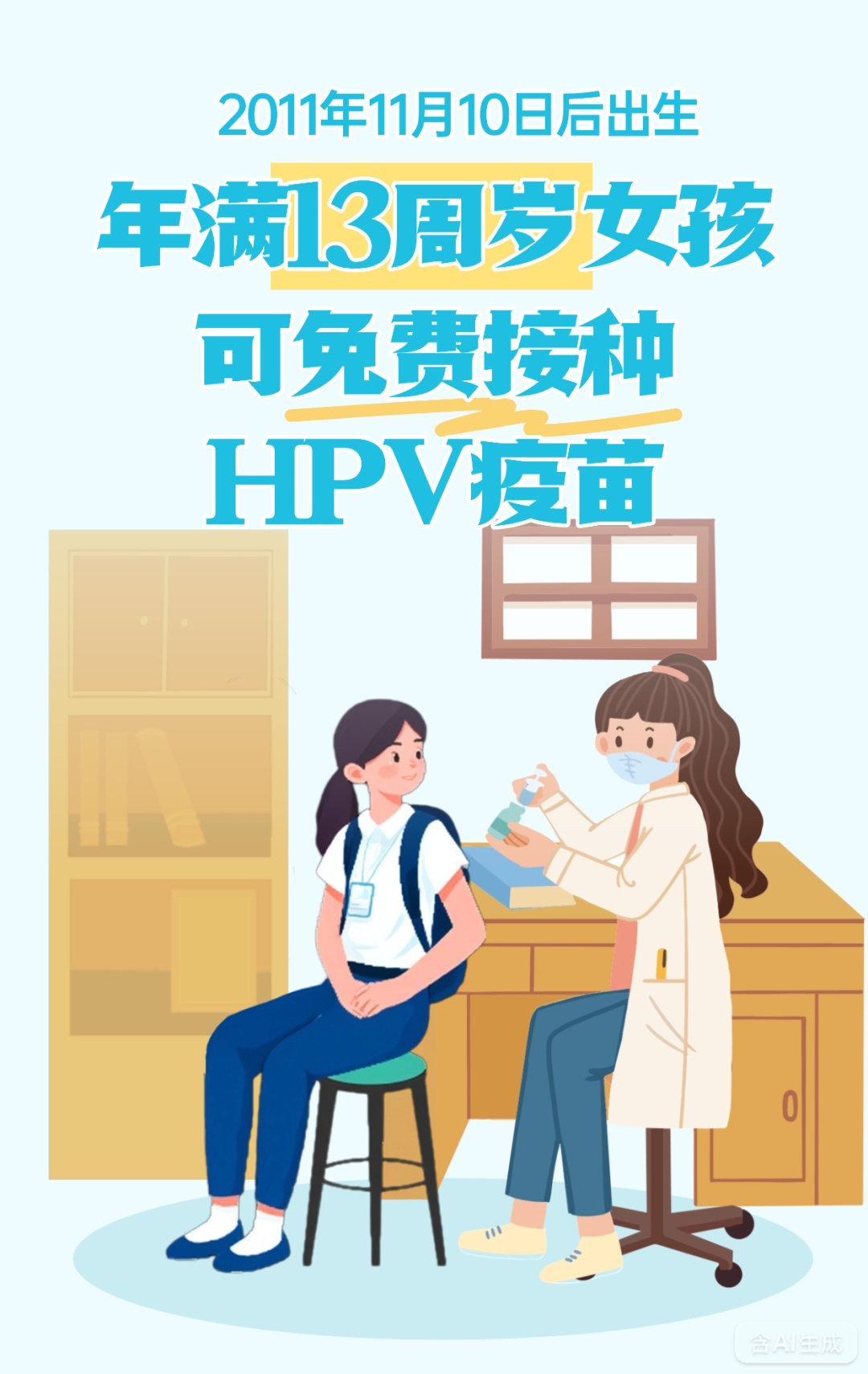 市卫健委介绍,自2025年11月10日起,我国将在现行国家免疫规划疫苗基础上,将人乳头瘤病毒(HPV)疫苗纳入国家免疫规划,组织各地为2011年11月10日以后出生的满13周岁女孩,免费接种2剂次双价HPV疫苗(间隔6个月)。此前已自费接种首针疫苗的适龄女孩,也可免费接种第二针。