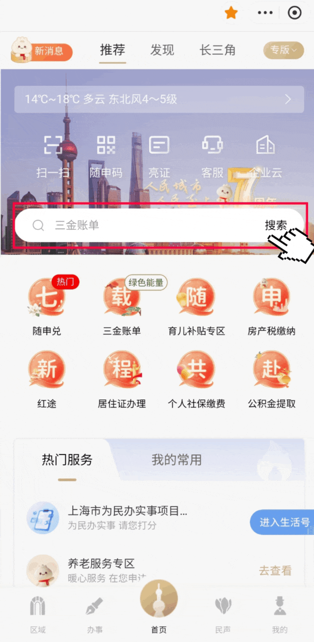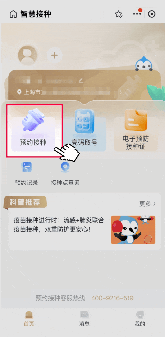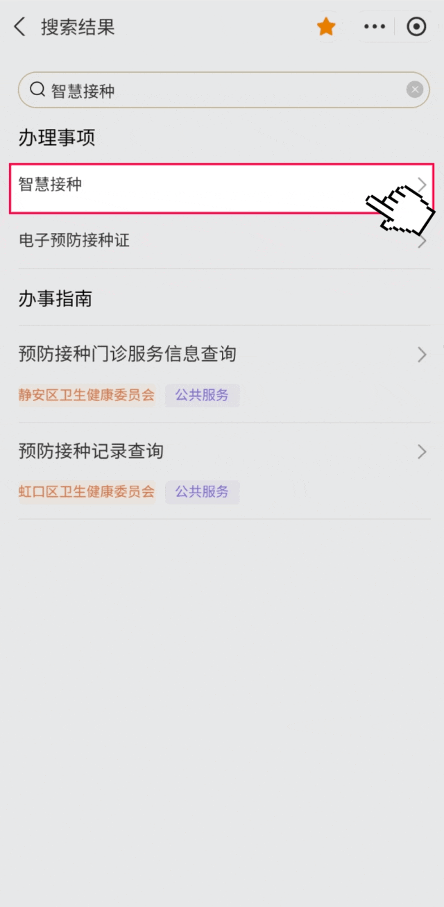 1.家长打开“随申办市民云”(APP/微信小程序/支付宝小程序),首页搜索“智慧接种”,点击进入对应服务。