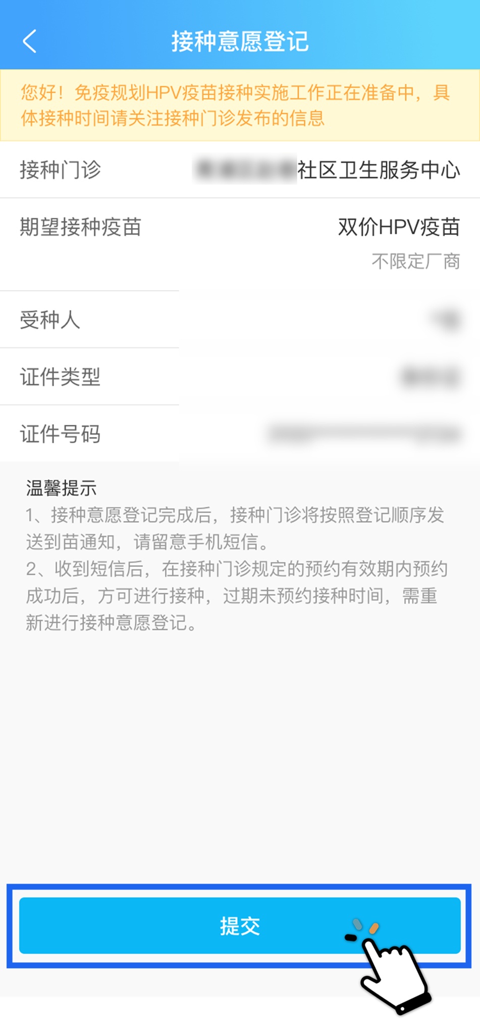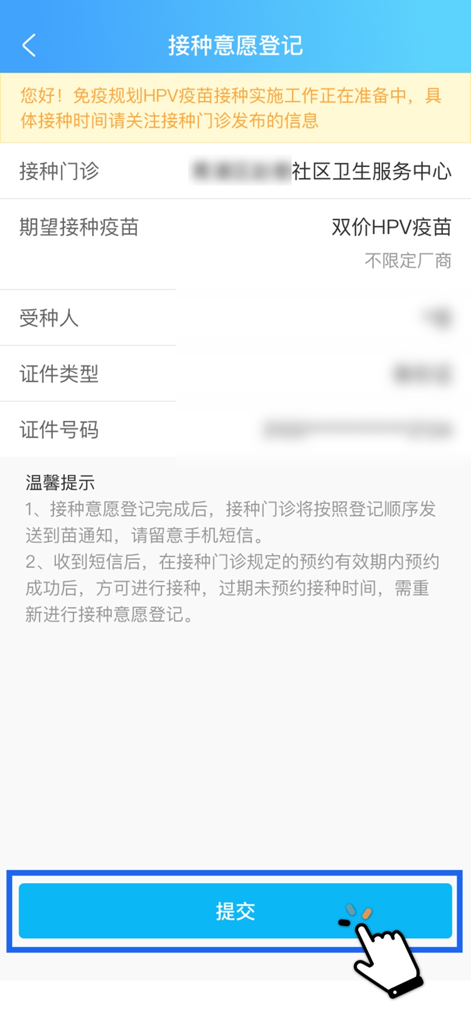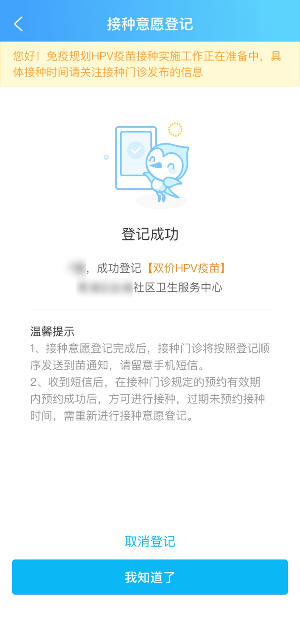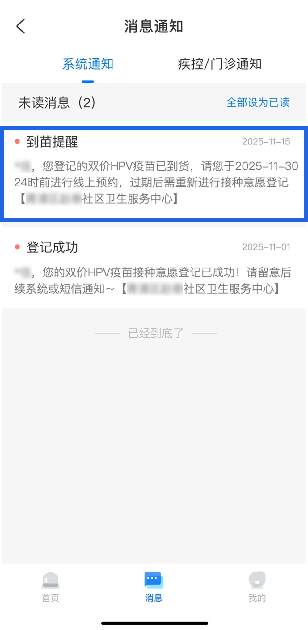4.完成接种意愿登记,接种门诊到苗后,将收到短信及系统通知。
