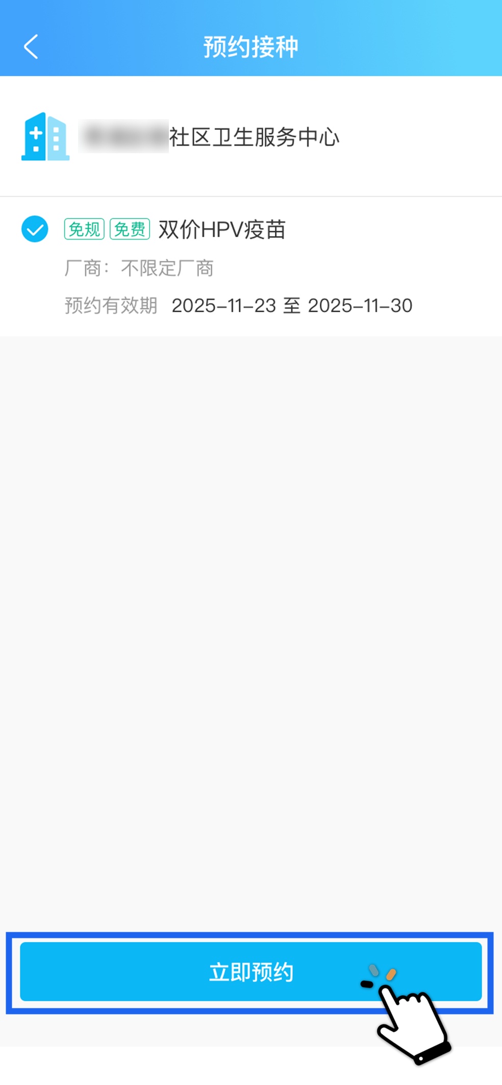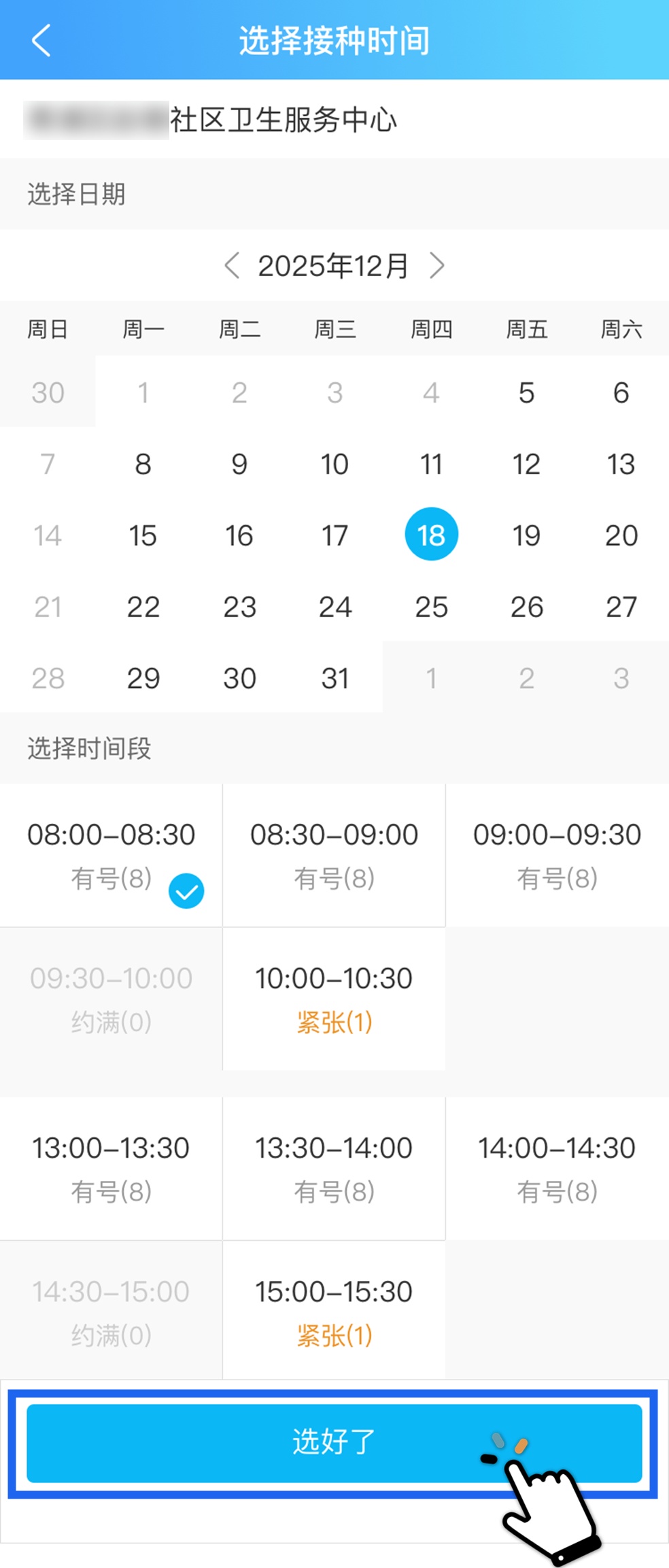 5.进行预约接种,选择预约时间并进行预约确认。完成预约后,根据预约时间准时前往医院接种疫苗。
