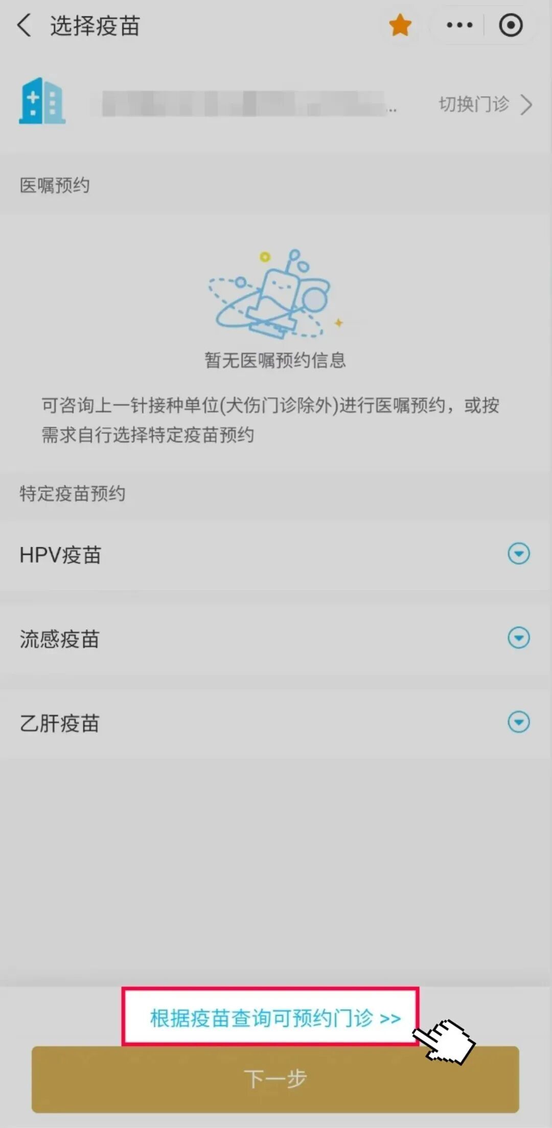 3.支持根据疫苗查询可预约门诊。选择对应的门诊、HPV疫苗,点击“下一步”。