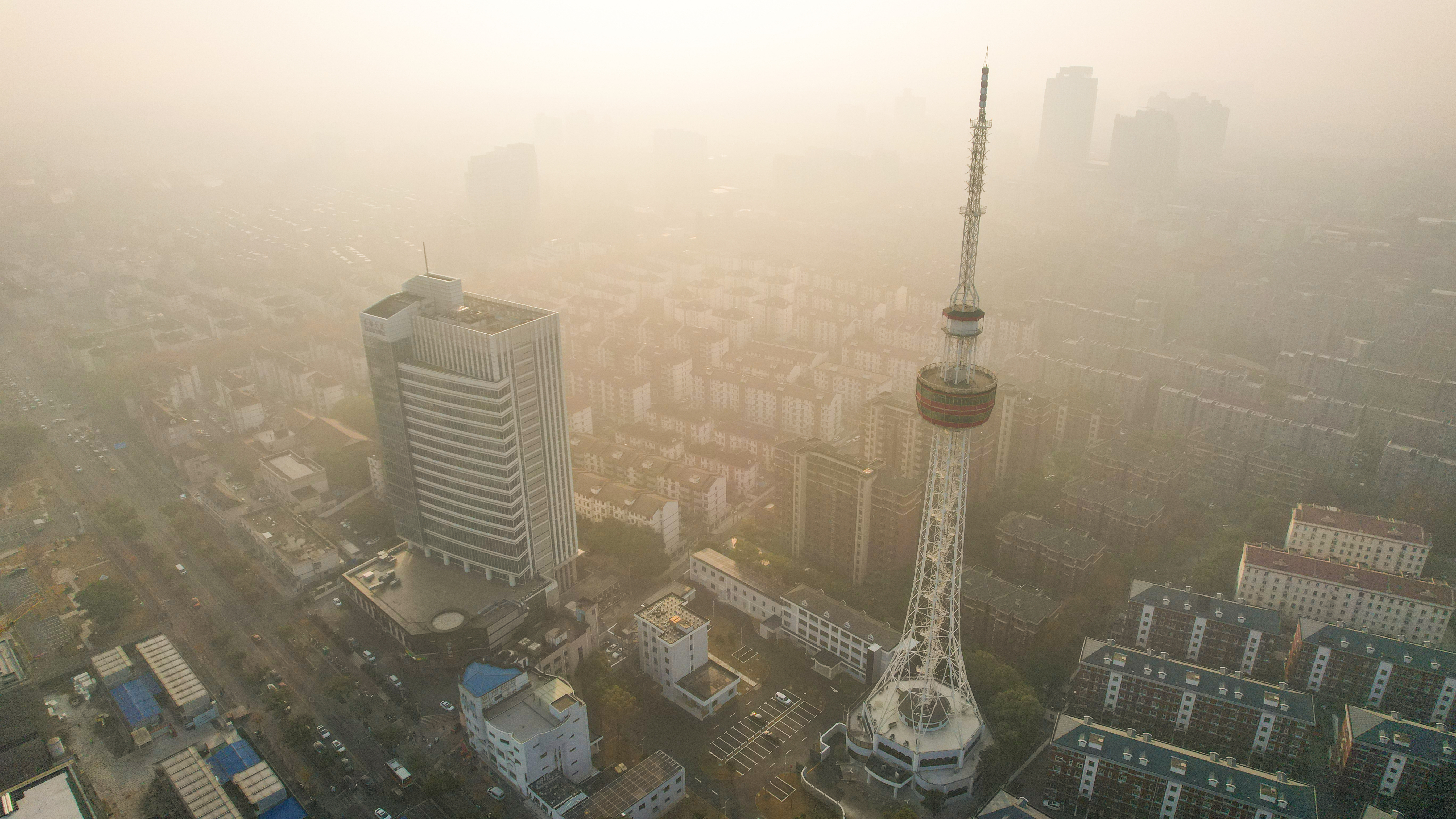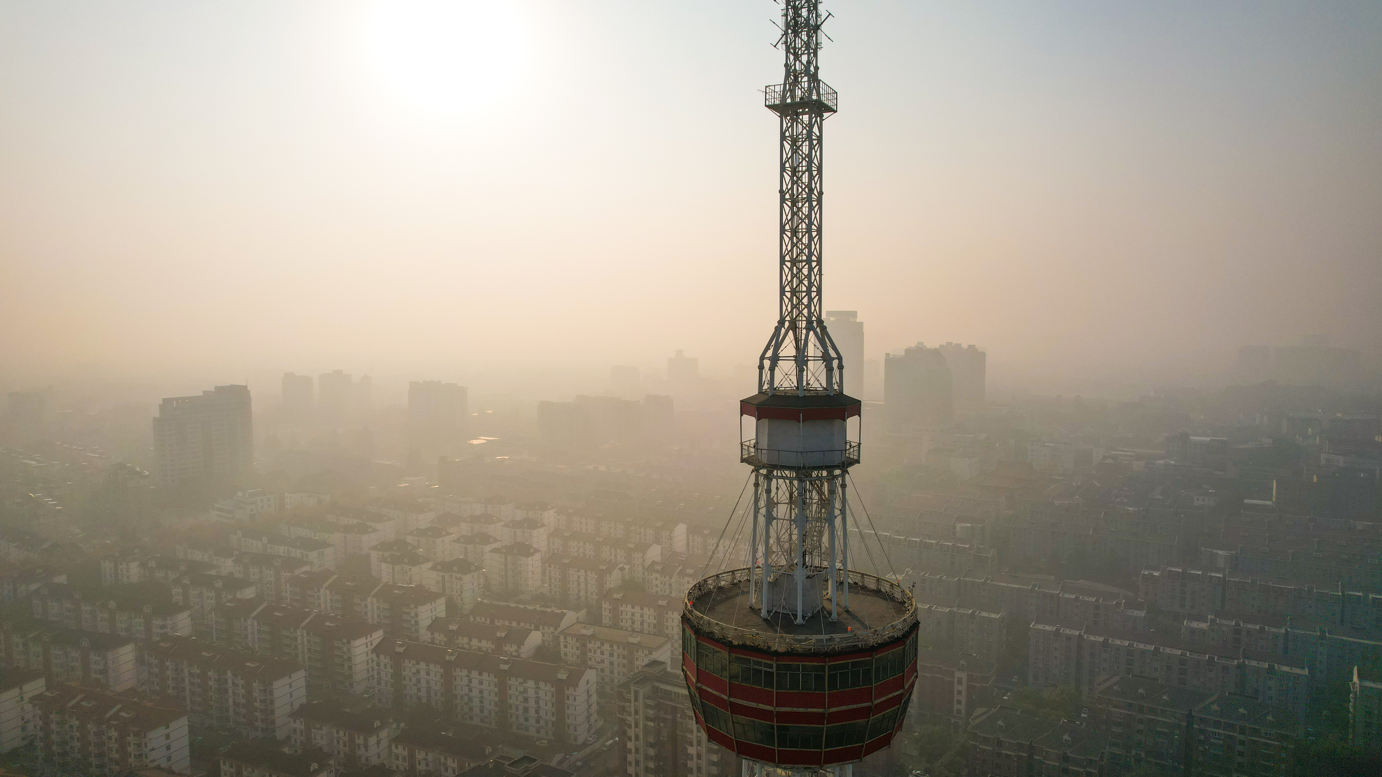 12月8日清晨,松江城区被浓雾笼罩。松江电视塔与周边建筑群隐于朦胧黄雾间,楼宇轮廓模糊。 记者 蔡斌 摄