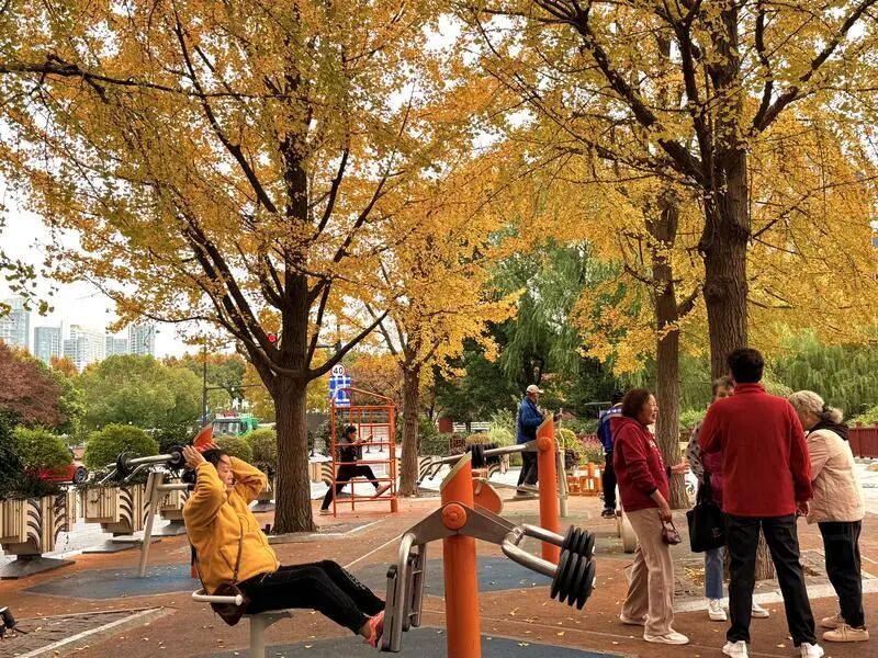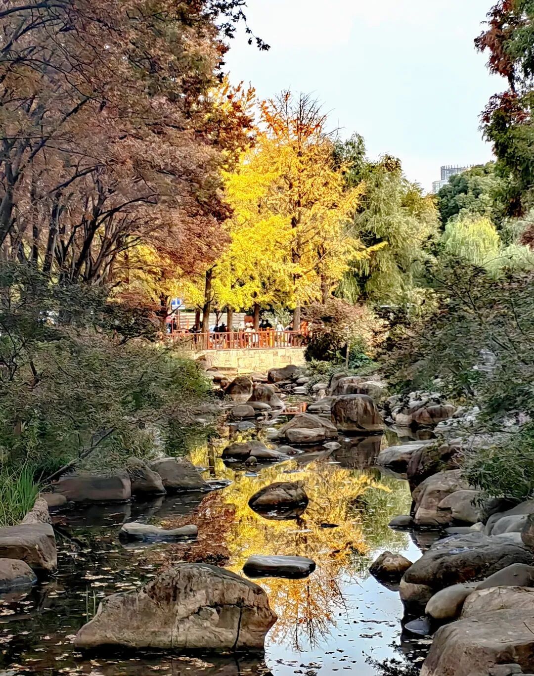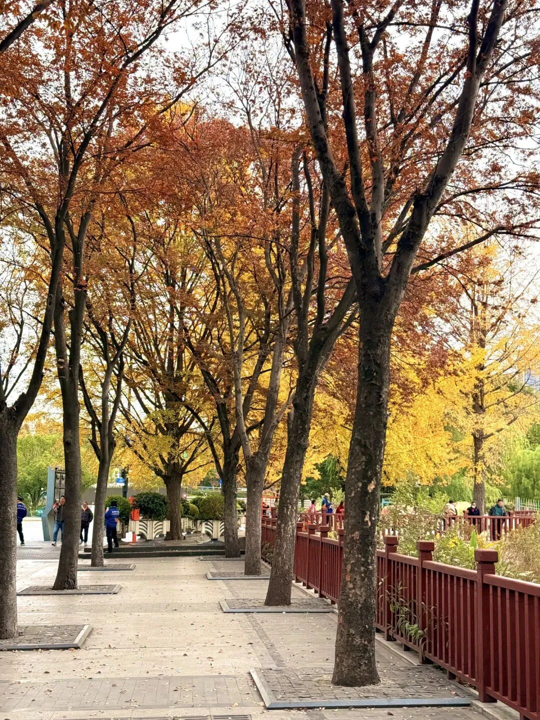 从地铁口出来拐个弯就到,没有围墙的遮挡,金灿灿的银杏林直接撞进眼里。午后两点的阳光刚好斜斜穿过枝叶,把地面铺成一片碎金,树下的 “古城能量站”超有生活气,阿姨爷叔坐在长椅上唠家常,旁边还有上班族趁着午休拉伸,连风里都飘着松弛感。