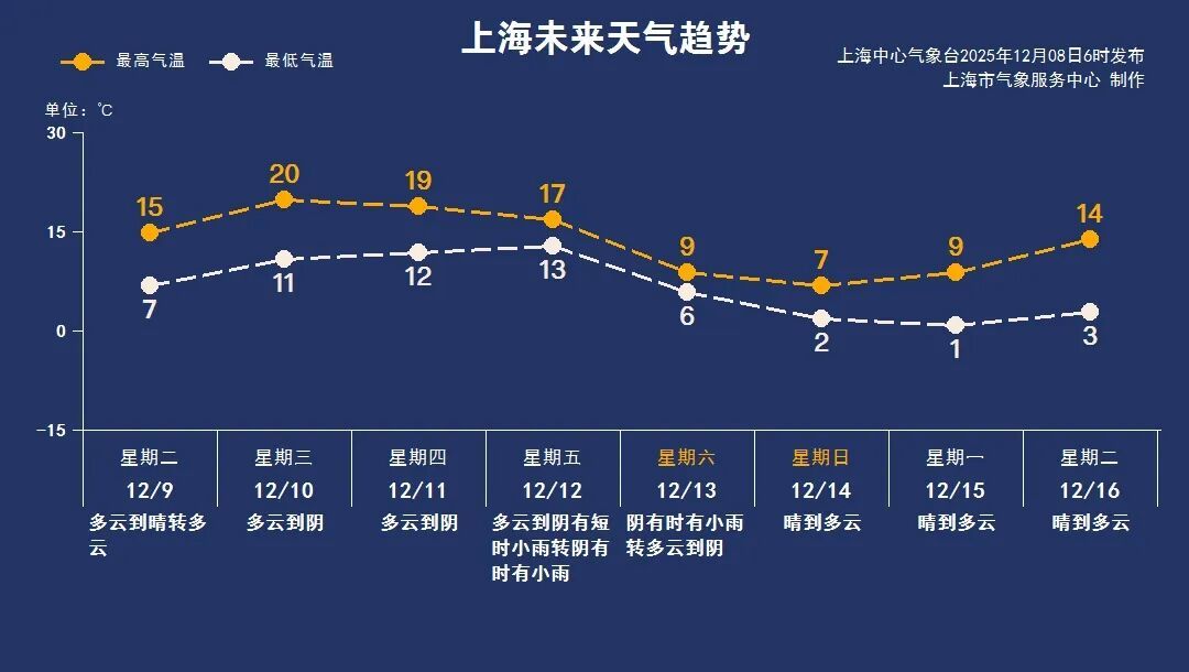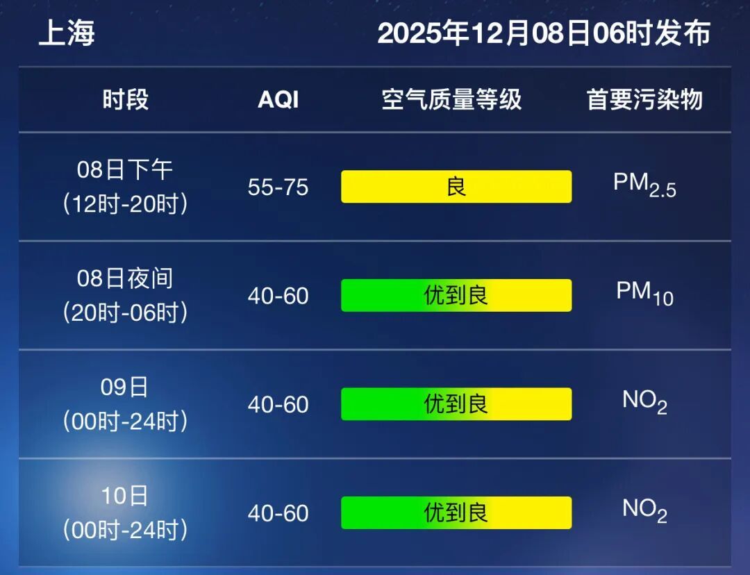 今天(12月8日)多云到晴,上午以前局部地区有雾。受弱冷空气影响,今天为偏北风,上午起风力加大至4~5级阵风6级。气温有所回落,全天在10~15℃。相对湿度在90%~40%,天气干燥,补水润肤和用火用电安全仍是近期的生活关注点。 上下班天气: 上班(6—9时):多云到晴,11~13℃ 下班(16—19时):多云到晴,15~11℃ 空气质量预报: 周二早晨为近期的气温低点,市区7℃,郊区更冷一些。不过这波冷空气势单力薄,回暖的势头迅速反扑,周中在暖湿气流的影响下,气温再现“2”字头。暖湿气流带来的除了升温,还有缓解秋燥的水汽,周中云系会有所增多。 随着一股较强冷空气抵沪,周后期有一次降雨、大风和降温的天气过程。这波冷空气颇有威力,周末至下周初,气温全程被压制在个位数,申城将发起第二轮入冬攻势。 12月9日(周二):多云到晴转多云,7~15℃ 12月10日(周三):多云到阴,11~20℃ 12月11日(周四):多云到阴,12~19℃ 12月12日(周五):多云到阴有短时小雨转阴有时有小雨,13~17℃
