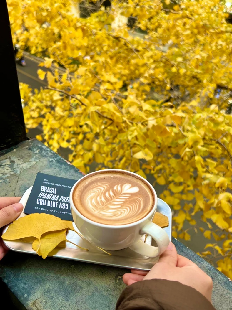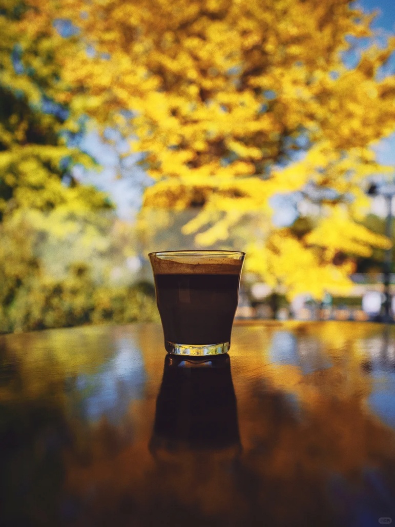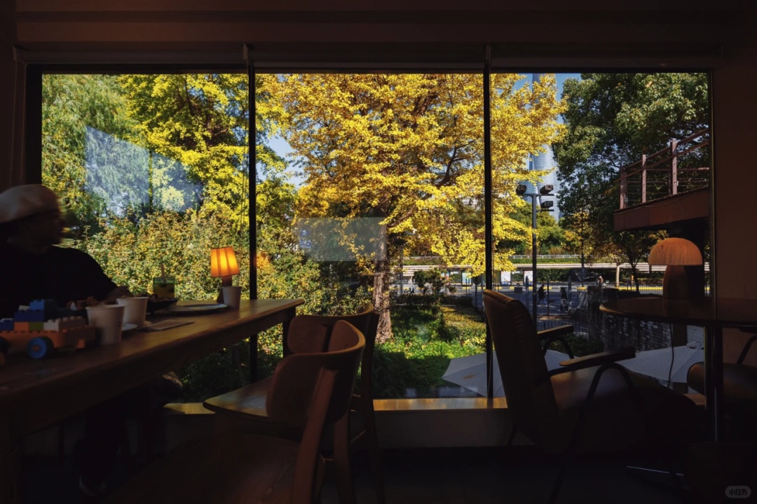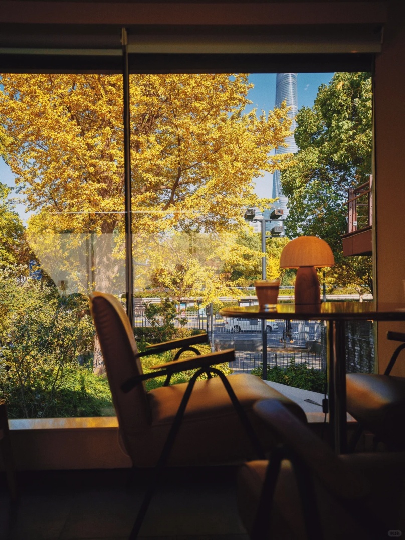 机位在咖啡店二层进门右手边,有两个位置可以拍到窗外的银杏