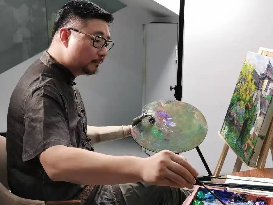 在教学与创作的道路上,科技为张粤成带来了特殊助力:2021年,他作为上海傲意科技的产品体验官,免费安装了人工智能仿生手。这只由精密零件构成的“金手”,能灵活完成抓、握、捏等多种手部动作,改变了他的生活与创作状态。“这让我感觉自己和健全人没什么两样,这一点对我来说最为重要。” 张粤成感慨道。