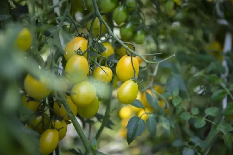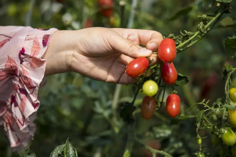 这片占地20余亩的小番茄采摘园,汇聚了9个小番茄品种,红色、绿色、黄色等颜色各异的小番茄,散发出阵阵清香。草莓番茄红绿相间,沙瓤绿籽、酸甜交织;碧玉番茄翡翠色,果肉糯叽叽,风味独特;大紫娃番茄表皮油亮,呈紫黑色,外皮泛着小点,口感酸甜恰到好处;樱桃番茄咔嚓脆响,像阳光封存的天然水果糖;黄鹂番茄,黄色的外皮,皮薄如纸,一口咬下去,满口爆汁,风味浓郁……