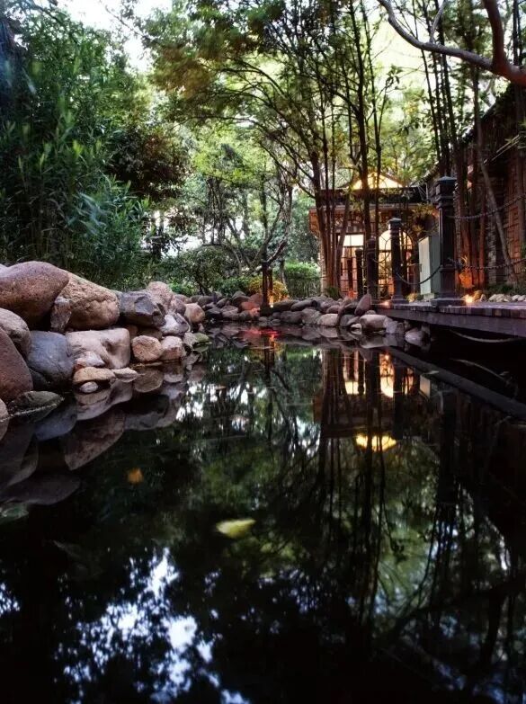 近2000平米的中式园林花园里,小桥流水、鲜花鲜果相映成趣。古杏树、枇杷树,石榴树、桔树等树种寄托着美好祝愿。推窗见绿的景致让博主赞不绝口。