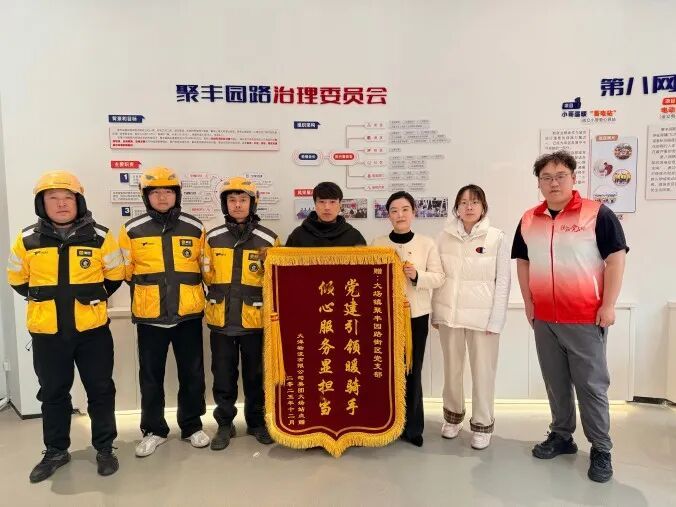 近日,宝山区美团大场站点的骑手代表们捧着一面鲜红锦旗,走进了聚丰园路街区党支部工作站。锦旗上“党建引领暖骑手,倾心服务显担当”这14个字,是骑手们对党支部一路温情陪伴的致谢,更是基层党组织与“城市摆渡人”双向奔赴的生动注脚。
