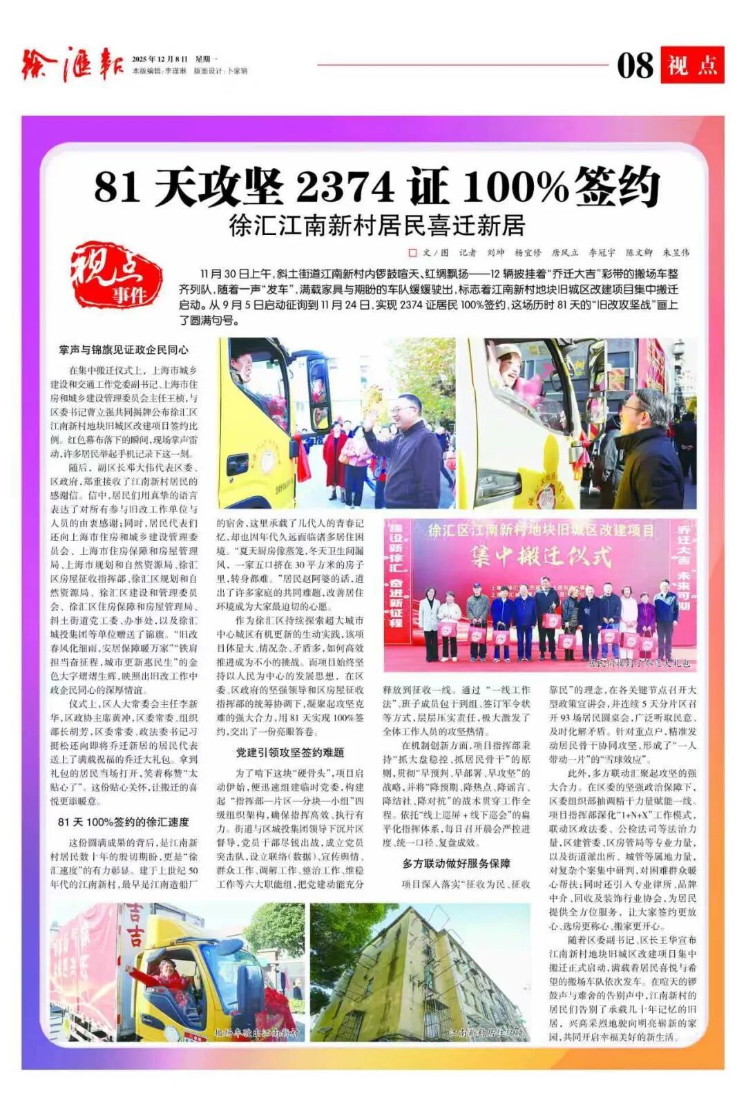 历经81天高效攻坚,江南新村2374证居民100%签约圆满收官,喜气洋洋迎来集中搬迁!建于20世纪50年代的老小区,居民们终于告别了过去岁月。项目创新四级组织架构、凝聚多方强大合力,以“徐汇速度”助力圆梦。如今锣鼓喧天,居民笑逐颜开,满载喜悦的车队在感谢与祝福声中,驶向未来崭新家园!
