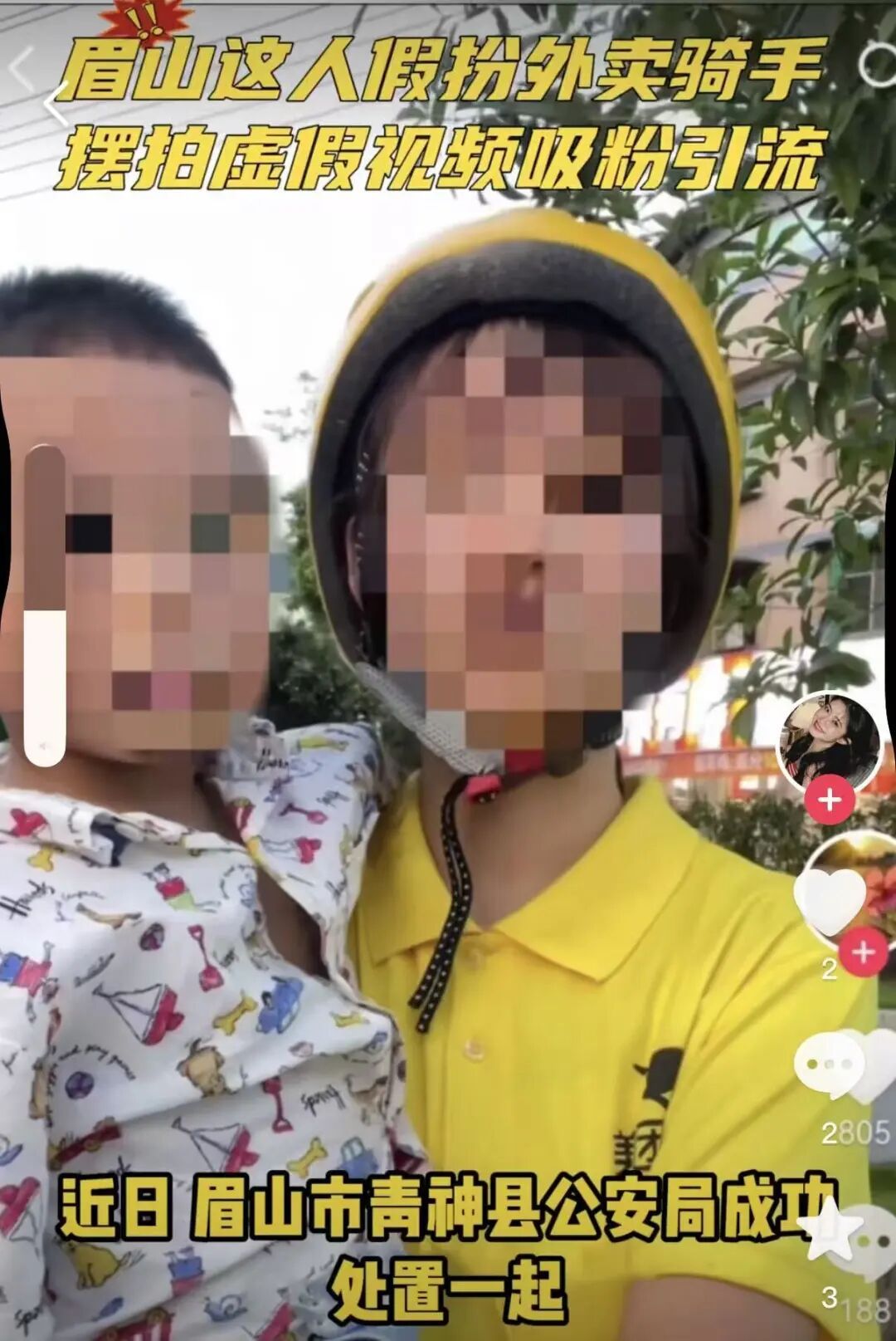 某外卖平台相关负责人透露,一些自媒体为获取流量,刻意摆拍“骑手苦情剧”,如“等单的时候用鼻饲管喂养患儿”“超时半小时抱着患儿求顾客别给差评”等虚假情节,引发大量公众关注和媒体报道。相关调查显示,从服装道具的购买到剧本设计,再到短视频拍摄、炒作传播、流量变现,一条营造“骑手苦情人设”来博取公众同情的灰色产业链已经形成。