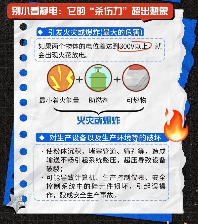 静电可以使生产中的粉体沉积,堵塞管道、筛孔等,造成输送不畅引起系统憋压,超压能导致设备破裂。贮运塑料等产品过程中,静电放电会导致产品熔融、粘结、变色甚至分解变质、报废等。静电放电能量可能导致计算机、生产控制仪表、安全控制系统中的硅元件损坏,引起误操作而酿成事故。