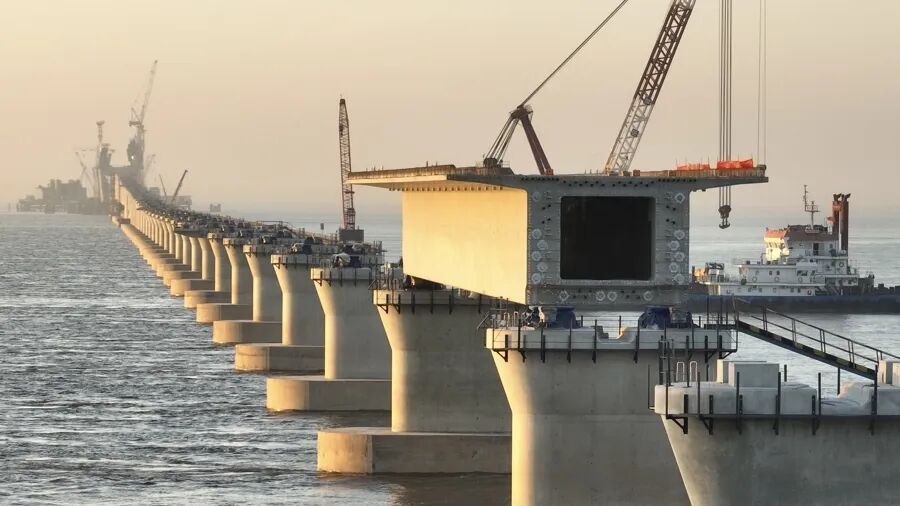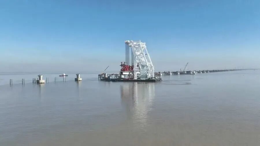 近日,通苏嘉甬高铁的控制性工程杭州湾跨海铁路大桥宁波侧首孔箱梁顺利架设,标志着大桥的海中引桥进入全面架梁施工阶段。