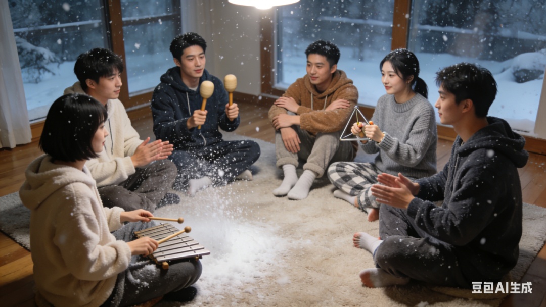 通过雨棍、沙锤、三角铁及肢体轻接触(如击掌、碰肘、跺脚等),共同创造出富有节奏感的打击乐,模仿下雪、风吹、阳光、溪水的声音,构成一个浪漫的冰雪音乐会。