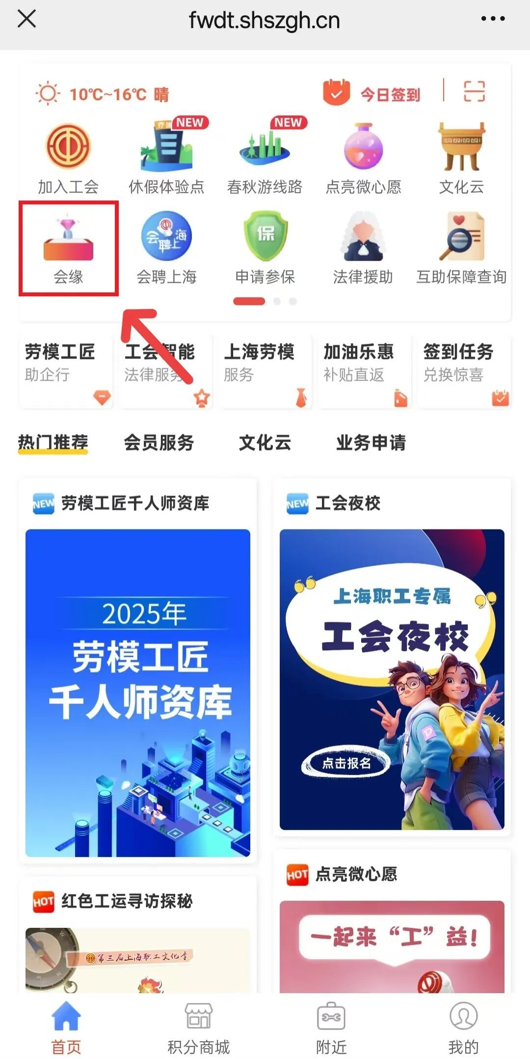 进入申工社微信公众号,点击底部菜单栏【服务大厅】,点击进入【会缘】。