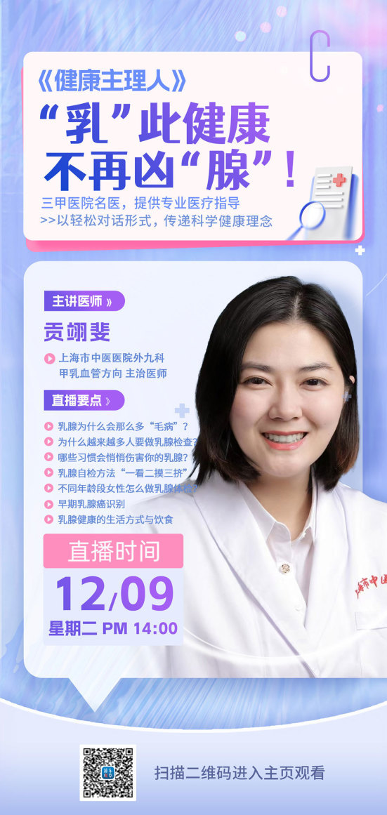 本期邀请的嘉宾是上海市中医医院外九科甲乳血管方向主治医师贡翊斐。很多女性朋友平日里可能觉得乳房痛、摸到结节,到底严重吗?今天我们请来贡医生带大家认识乳腺健康。