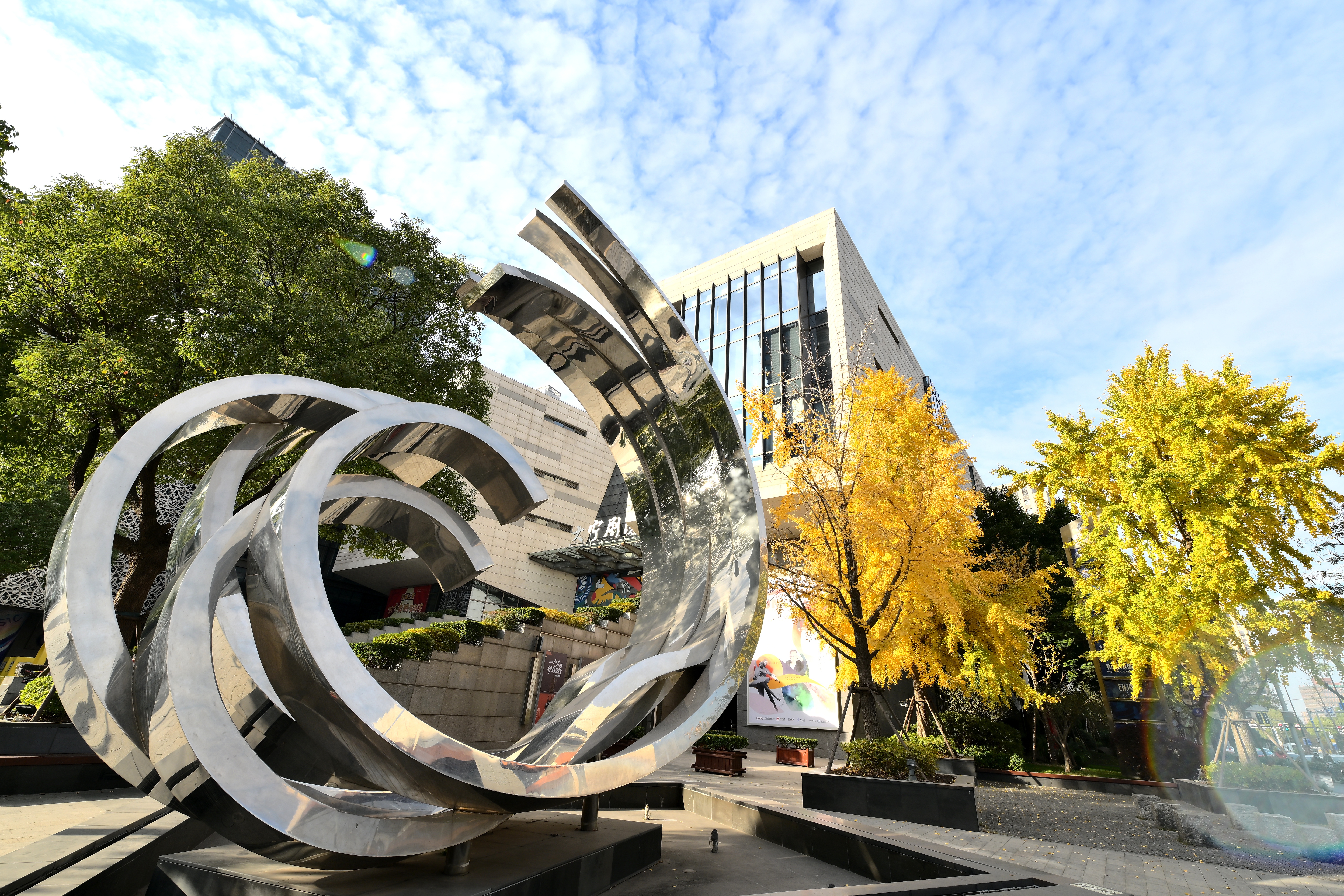 艺术与自然在此对话——坚硬的线条被柔和的落叶环绕,现代感的雕塑在金黄的帷幕下,竟生出几分禅意。光影穿过枝叶,在地面绘出流动的斑驳,仿佛时间也有了形状。