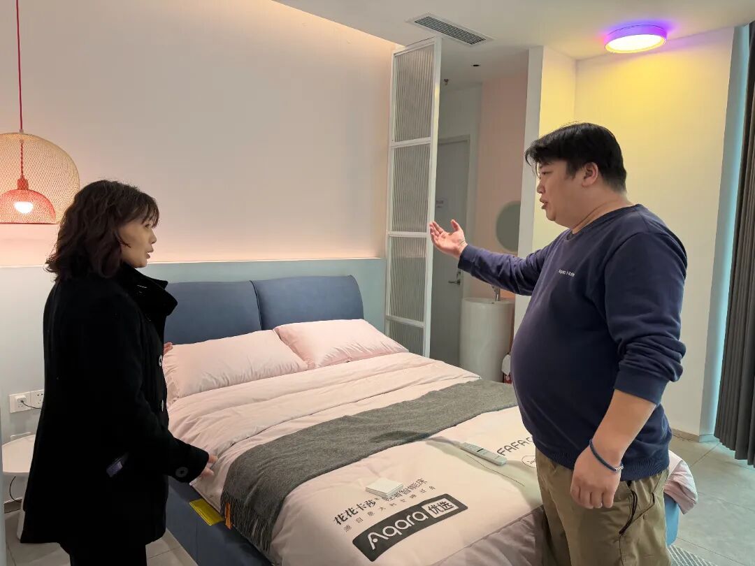 下午2点,在青浦万达茂店一家智能家居体验馆内,市民张阿姨前来咨询了解智能家居产品,在工作人员引导下,张阿姨体验了人脸识别瞬间开锁的智能门锁,感受了具有托举模式的智能床,这些产品解决了老人忘带钥匙、起床困难的困扰,也让她切实感受到智能家居的便捷与实用。