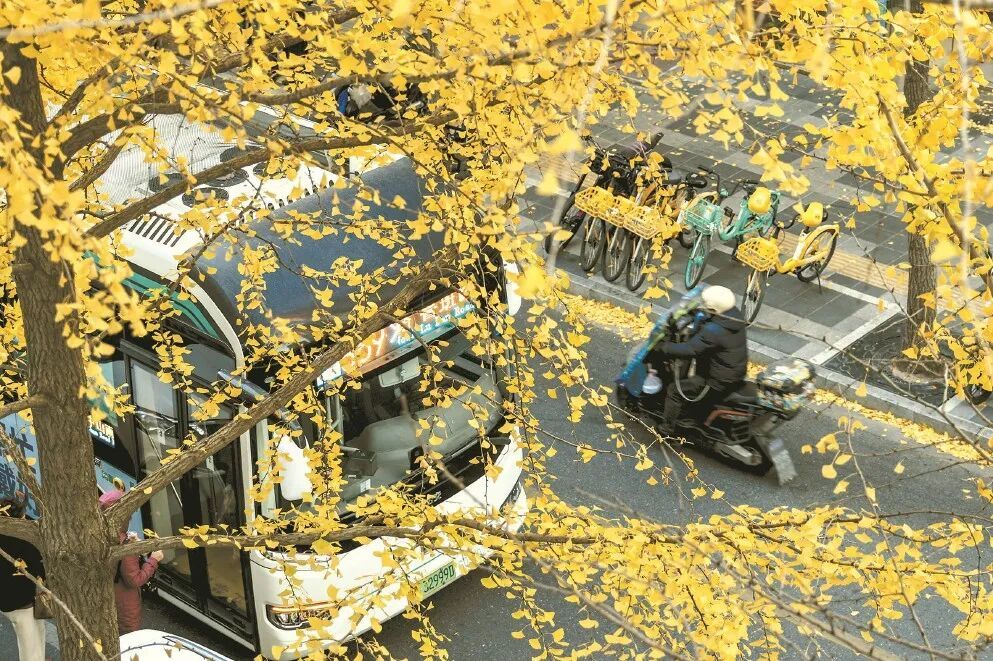 近日,局门路上,金黄的银杏树穿过沿街的电话亭、公交站牌,一步一景让人神醉心怡。本报记者 袁婧 摄