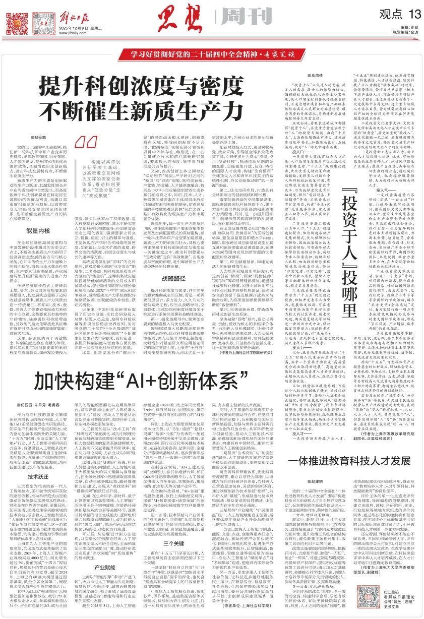 作为前沿科技的重要引擎和新经济增长点的核心构成,人工智能(AI)正深刻重塑技术研发路径、知识生产机制和产业组织形态,成为驱动创新体系跃升的关键力量。“十五五”时期,全面实施“人工智能+”行动,以人工智能引领科研范式变革,有望引领人工智能从技术突破迈入全要素赋能自主创新体系的阶段,进而通过“创新带应用、应用促创新”的螺旋式发展,为科技强国建设筑牢智能基座。