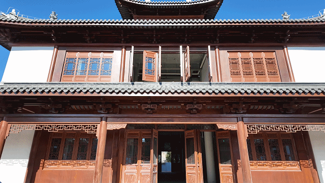 主楼南立面为两层歇山顶建筑,明间屋面挑出瞭望塔楼,主打一个庄重气派。