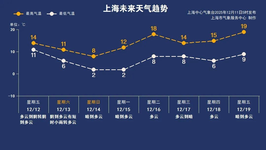 12月12日(周五):多云到阴转阴到多云,11~14℃
