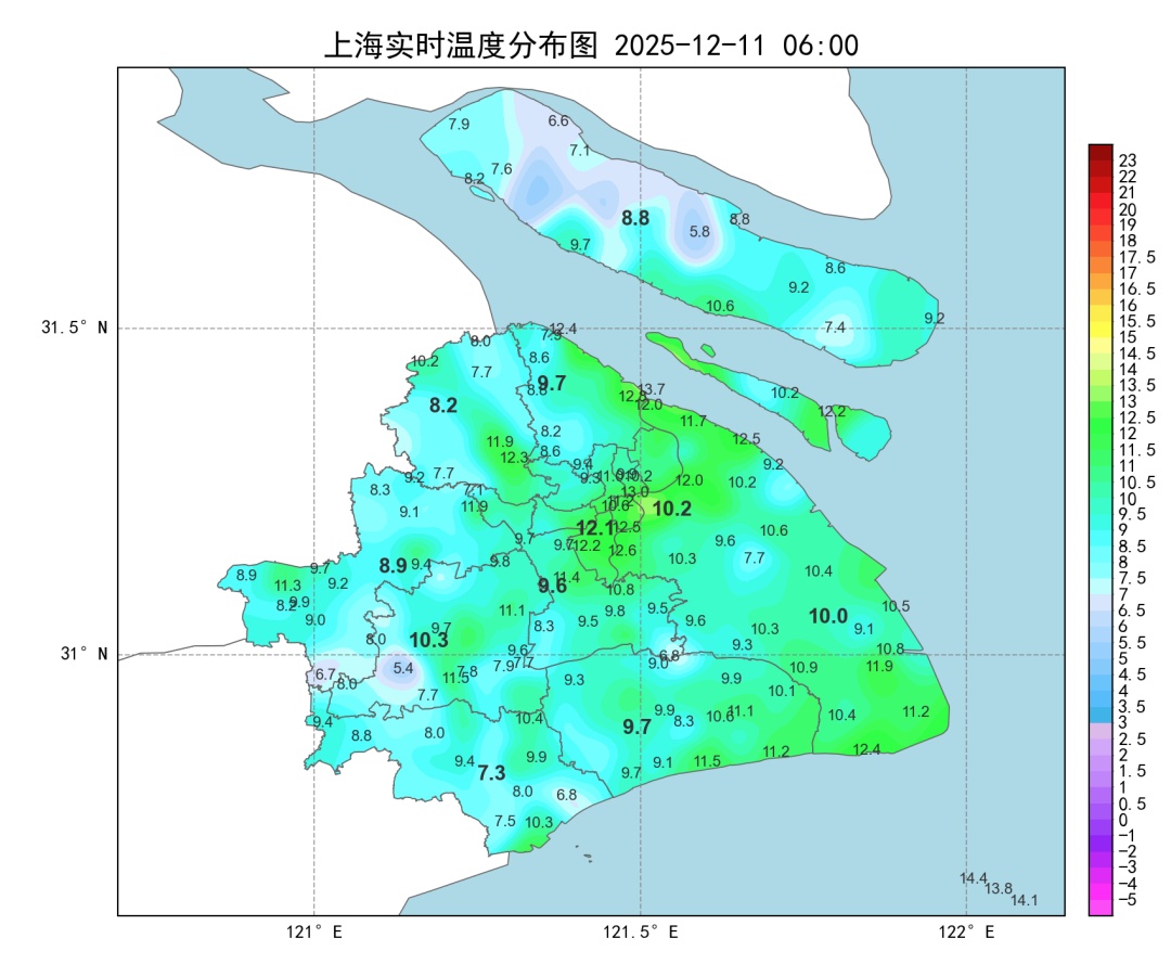 昨夜今晨本市大部地区出现大雾天气,部分地区能见度不足200米,今天(12月11日)上午以前东部地区仍有雾,出行注意交通安全。早间市区最低气温起步在12℃,郊区在6~11℃。白天阳光回归,为晴转多云的天气。预计今日最高气温继续冲击18℃。西北风3~4级,中午转北到东北风4~5级阵风6级,沿江沿海地区5级阵风6~7级。相对湿度90%~35%。