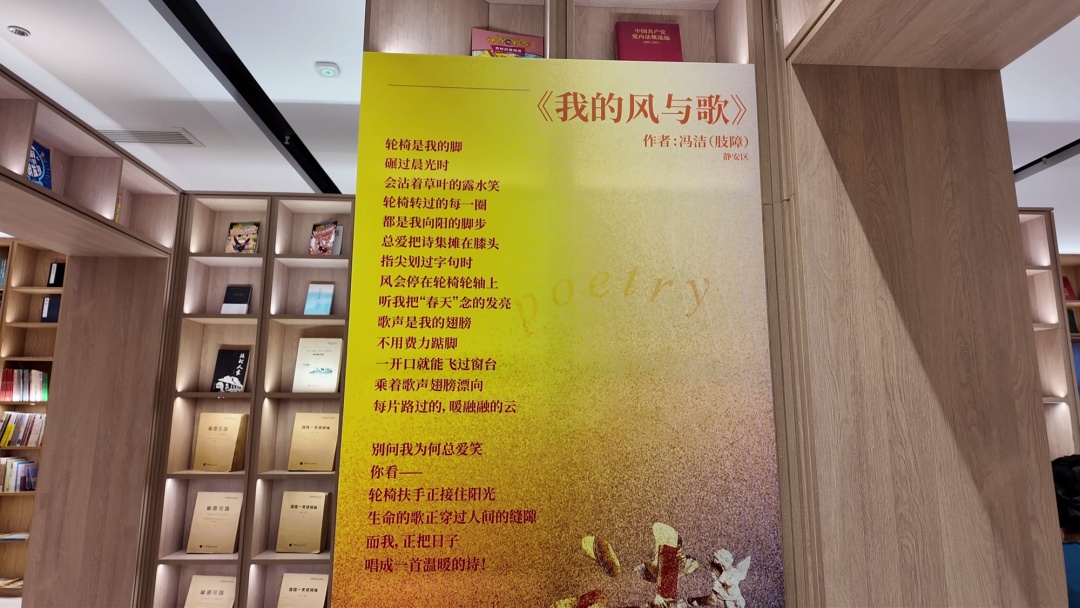 闭幕式当天,在上海书城6楼,同步开启了名为“诗之光”的残疾人诗歌作品展览,展出了在“诗歌创作”征集活动中残疾人创作的优秀获奖作品,让他们的才华与心声被更广泛地“看见”和“听见”。