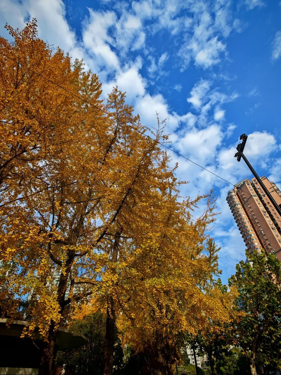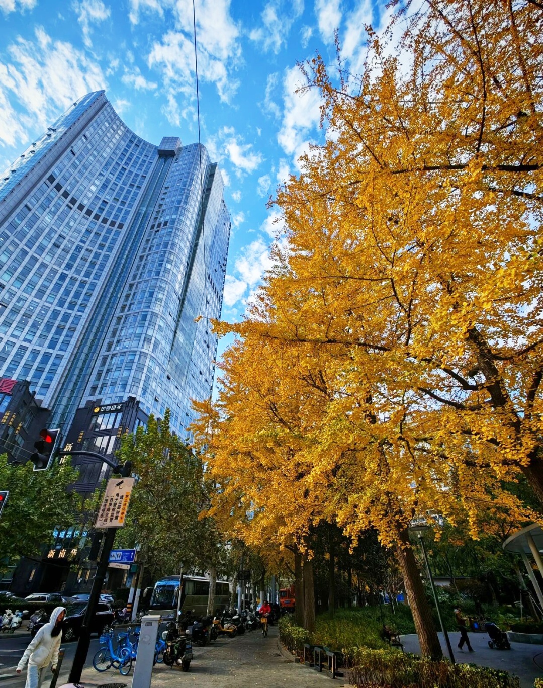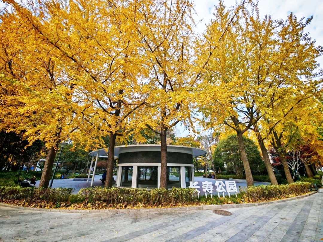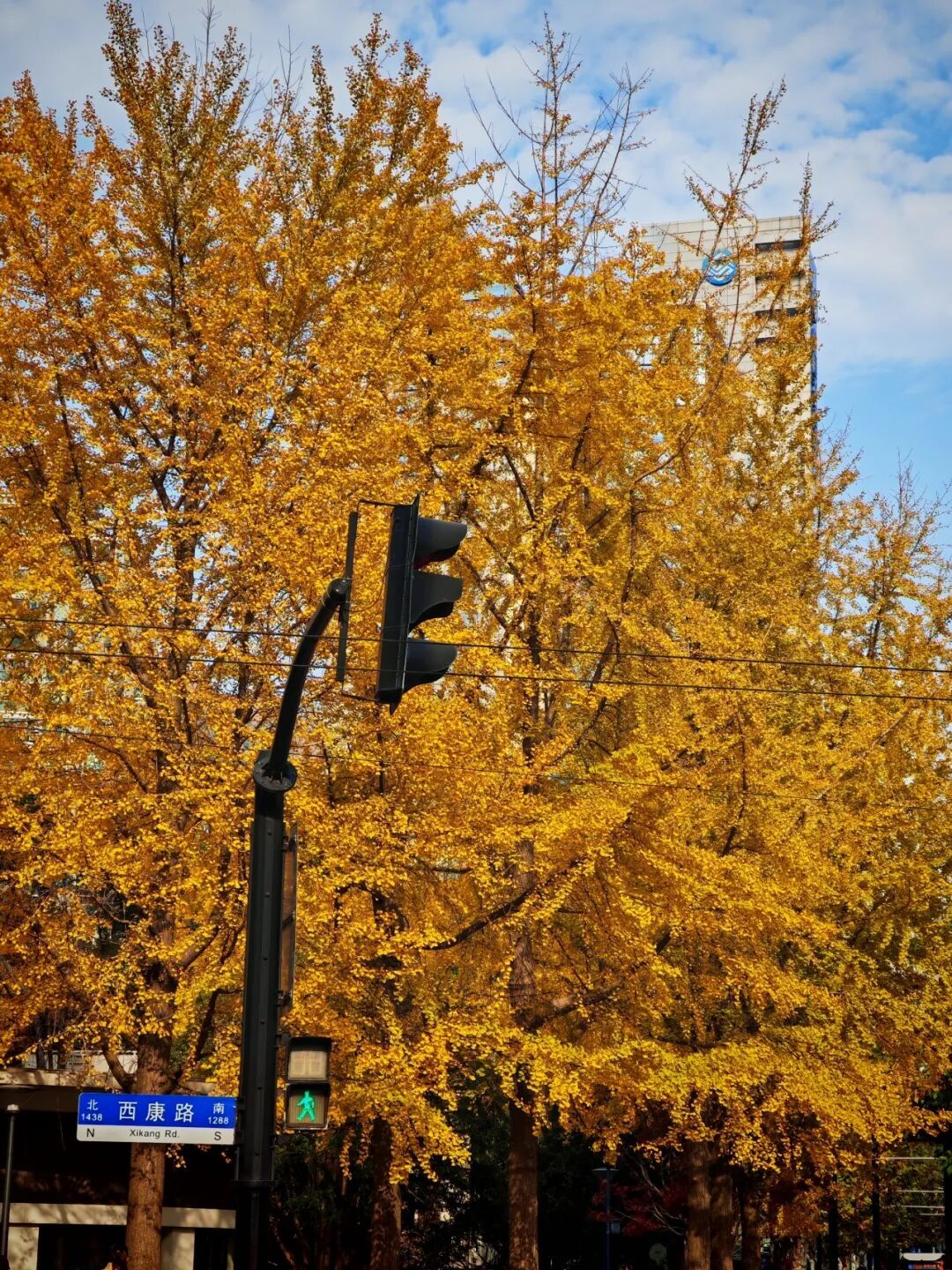 一枚枚小扇,扇开冬日序章,一树树金箔,便成了冬日新篇上的钤印。在长寿路和西康路交汇的路口,高大的银杏树已披上最浓郁的金色华服,在城市的天际线下构筑起一条流动的、温暖的黄金隧道。