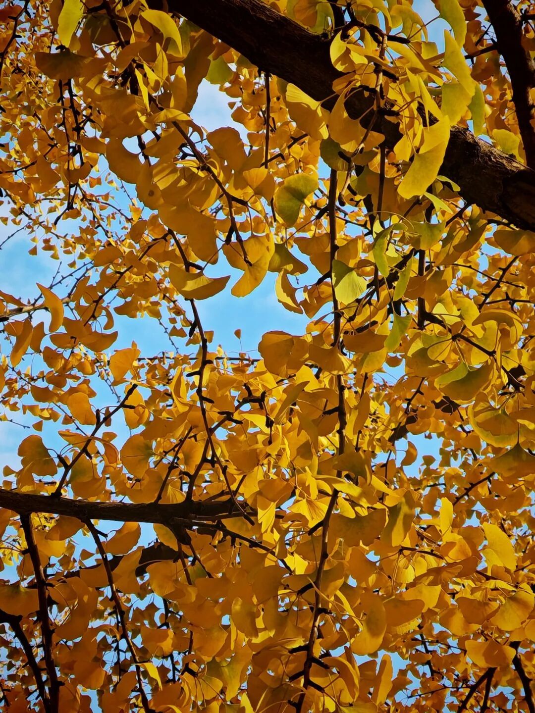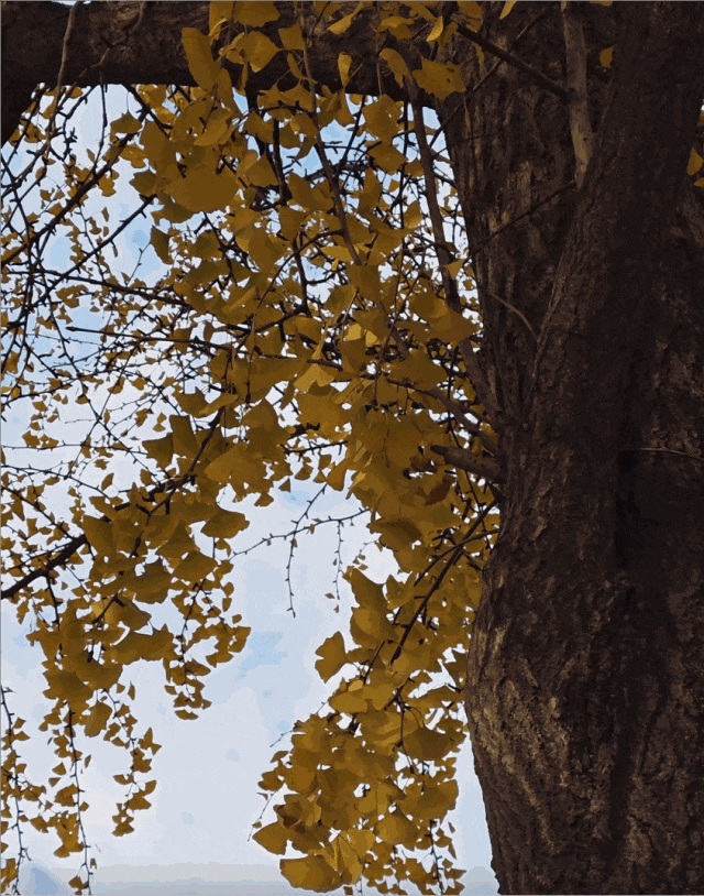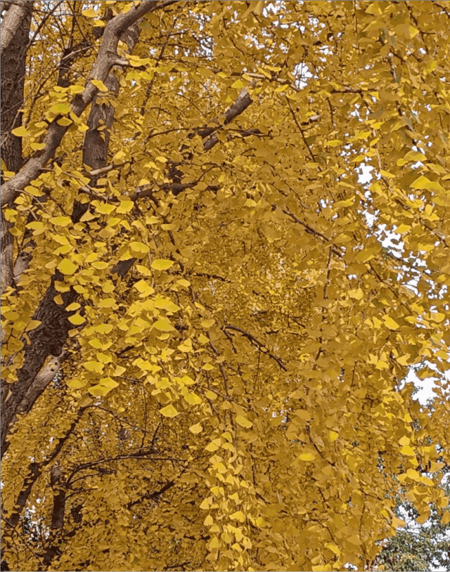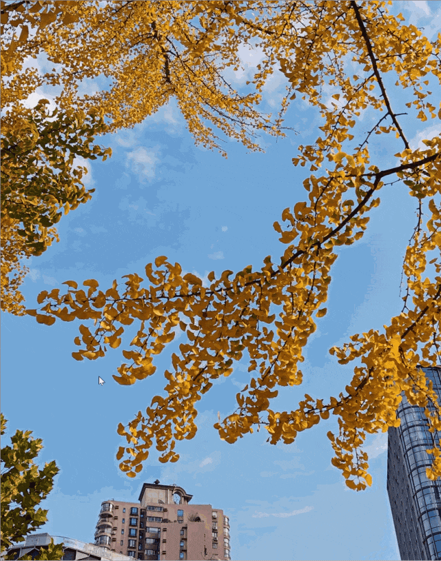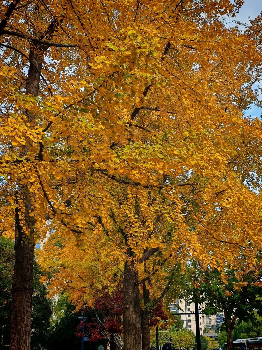 一枚枚小扇,扇开冬日序章,一树树金箔,便成了冬日新篇上的钤印。在长寿路和西康路交汇的路口,高大的银杏树已披上最浓郁的金色华服,在城市的天际线下构筑起一条流动的、温暖的黄金隧道。