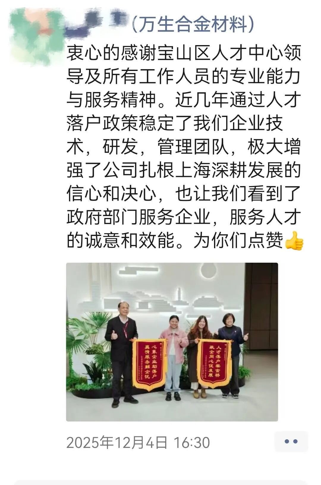 近日,宝山区人才发展服务中心收到上海万生合金材料有限公司及上海浦帮机电制造有限公司相关负责人送来的2面锦旗,对中心工作人员提供的专业指导和高效服务表示衷心感谢。 今年以来,中心已先后收到10面锦旗和感谢信,这些荣誉的背后,都有一个暖心的故事,承载着企业的信任与托付,更是中心践行当好人才服务“店小二”承诺的见证。 万生合金单位人事经理微信朋友圈图文