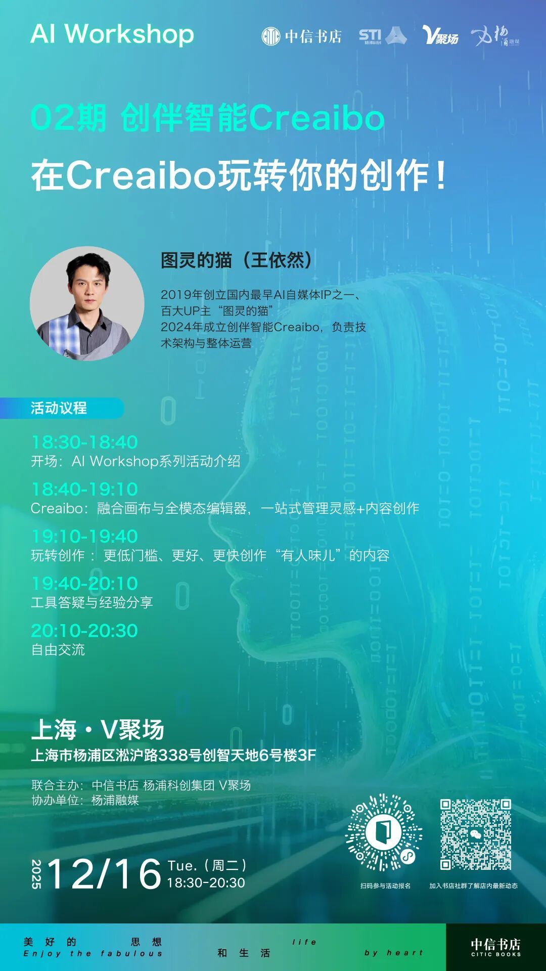 近日,由中信书店、杨浦科创集团、V聚场联合主办,杨浦区融媒体中心协办的“AI Workshop”系列活动在V聚场拉开帷幕。 “AI Workshop”系列活动聚焦人工智能在内容创作与知识管理领域的实际应用,通过邀请AI产品创始人、团队成员和核心用户,结合“深度讲解+现场实操+案例演示”的形式,帮助创作者、职场人和学习者掌握AI工具的真实使用方法,提升创作、学习与思维效率。