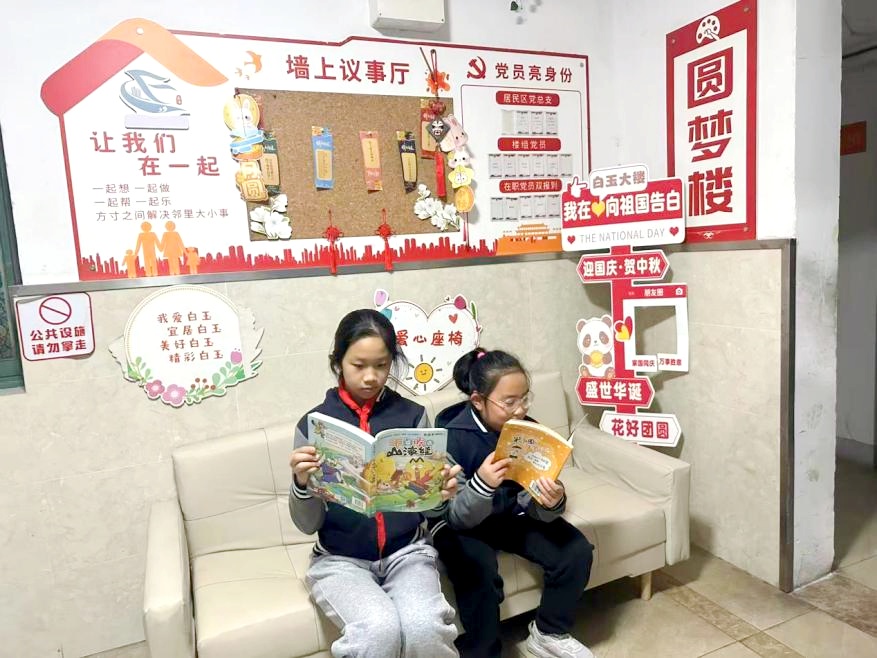 “休息休息聊聊天”的爱心沙发、“一起想、一起做、一起帮、一起乐”的“墙上议事厅”、“第二梯队”手绘的“星辰大海”彩绘墙、满载书籍的“共享书架”……在白玉大楼,“共享图书角”的微心愿拓展成“楼内公共客厅”的打造。居民在此或驻足欣赏、或静坐阅读、或商议共谈。