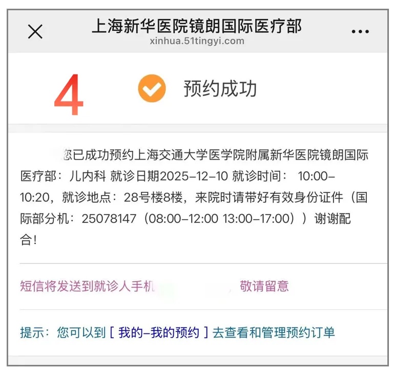 4、预约成功后,请查收预约短信,并在预约时段前往新华医院28号楼8楼镜朗国际医疗部门诊签到
