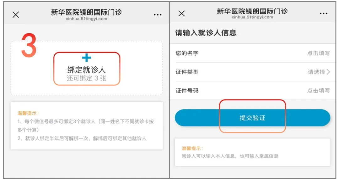 温馨提示:每个微信号最多可绑定3个就诊人,可绑定本人或家属。