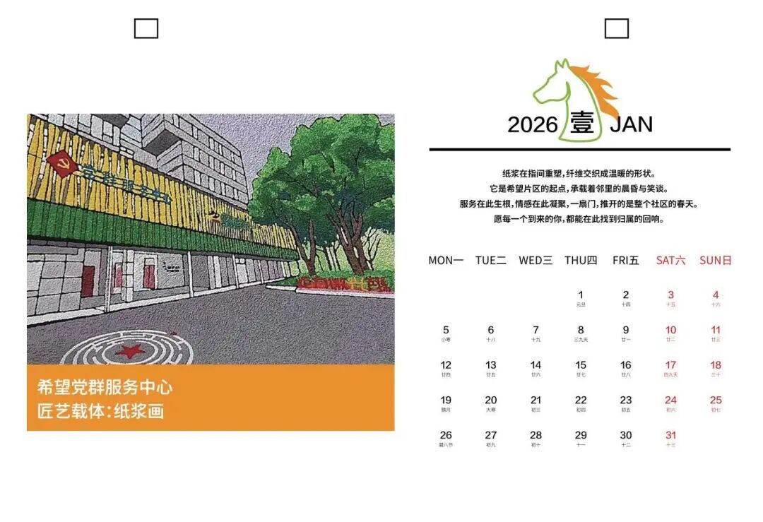 这个想法尤其契合了许多社区居民,特别是老年群体的实际需求。“不少老年居民更习惯使用纸质日历,翻页查看对他们来说更方便、也更亲切。”马陆镇双单一坊居委工作人员陈晓洁说。如今,这本日历被放置在希望片区各居委会服务大厅的显眼处,居民一进门便能看到。它不仅清晰标注日期节气,更将希望社区党群服务中心(我嘉·邻里中心)、理想之地等生活服务点位一一呈现,成为一本既实用又便民的“社区指南”。