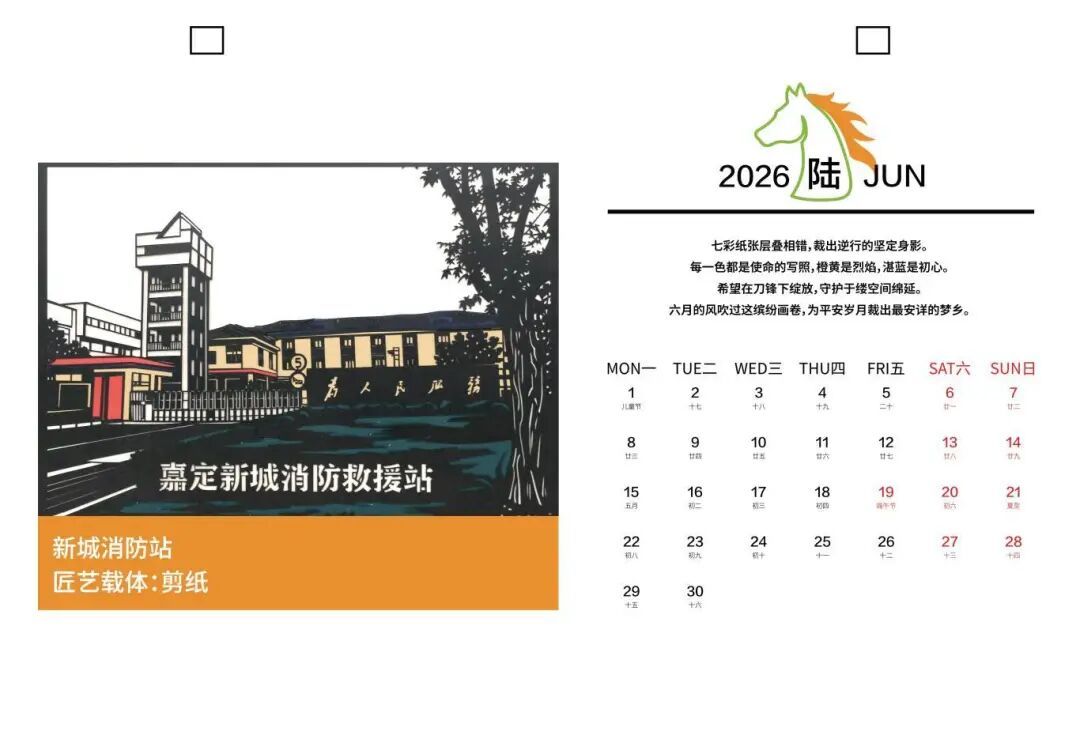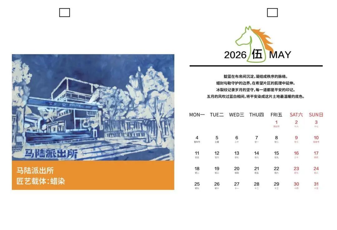 创作阶段同样凝聚匠心,每幅作品均由手工打造,并融入对地标精神的解读。在创作嘉定区新城消防救援站的剪纸作品时,沈海燕运用利落刀工与硬朗线条,传递出力量与信赖;而在马陆派出所的蜡染画里,她通过蓝靛的层层叠染,营造出庄重而温润的视觉层次。其余作品亦延续一致的美学语言,所有手稿经高精度扫描与数字调校后,最终在日历上鲜活呈现。