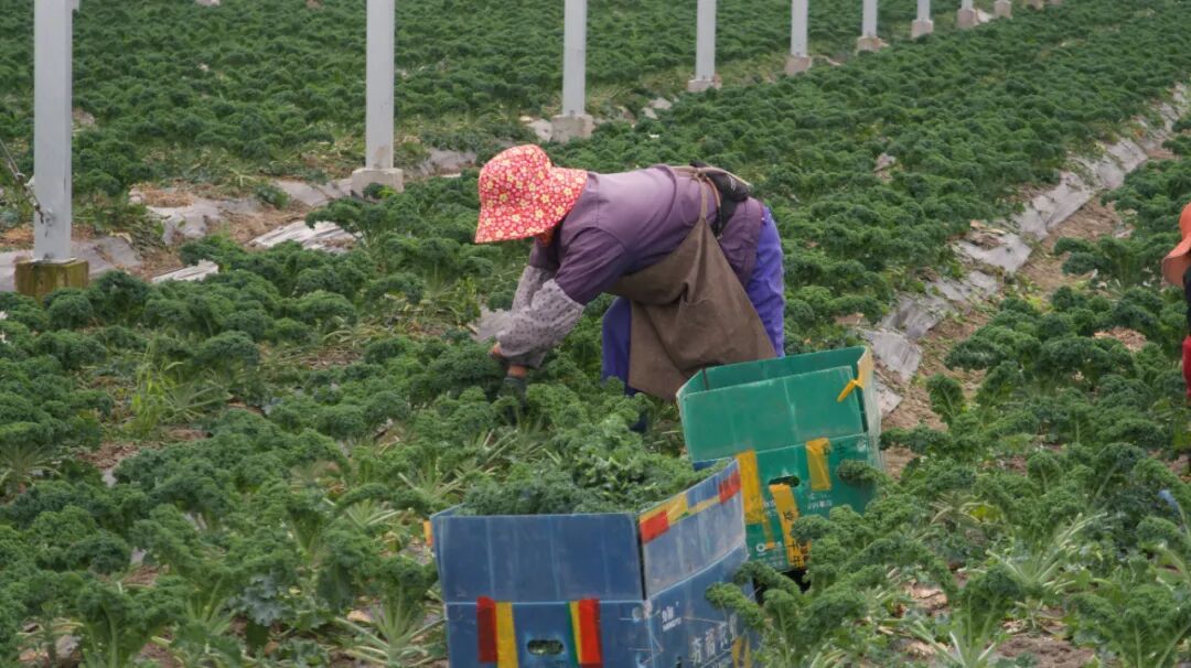 在合作社大棚内,羽衣甘蓝层层铺展、叶色浓绿,在冬日阳光下长势喜人。工人们正忙着采收、分拣、装筐。此次采摘的主要是进口“斯宝”品种,是市场上更为常见的羽衣甘蓝类型。