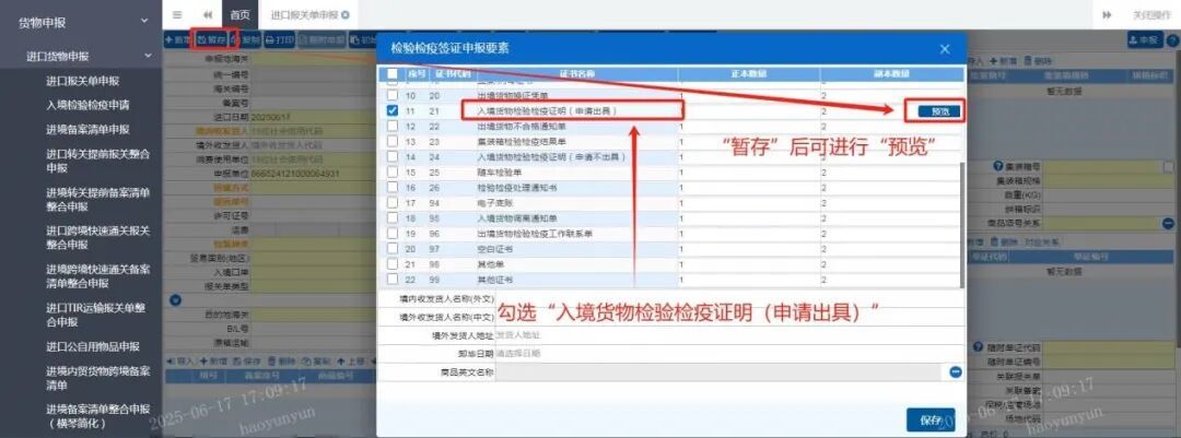 在“检验检疫签证申报要素”界面,勾选☑️“入境货物检验检疫证明(申请出具)”,该栏目右侧出现“预览”按钮(如下图所示)。点击“预览”按钮,即可预览电子证单内容格式,证单内容“所见即所得”。