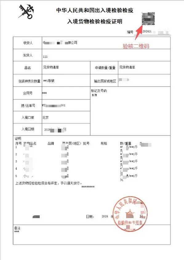 扫描《入境货物检验检疫证明》电子证单右上角二维码(如下图所示),