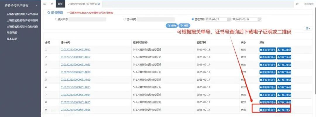 海关正式出具《入境货物检验检疫证明》电子证单后,企业可第一时间使用账号或卡介质登录全国版单窗,按以下路径“货物申报-检验检疫电子证书-入境检验检疫电子证书查询”进入查询界面,输入报关单号或证书编号即可查询和下载海关已签发的《入境货物检验检疫电子证明》或二维码(如下图所示)。