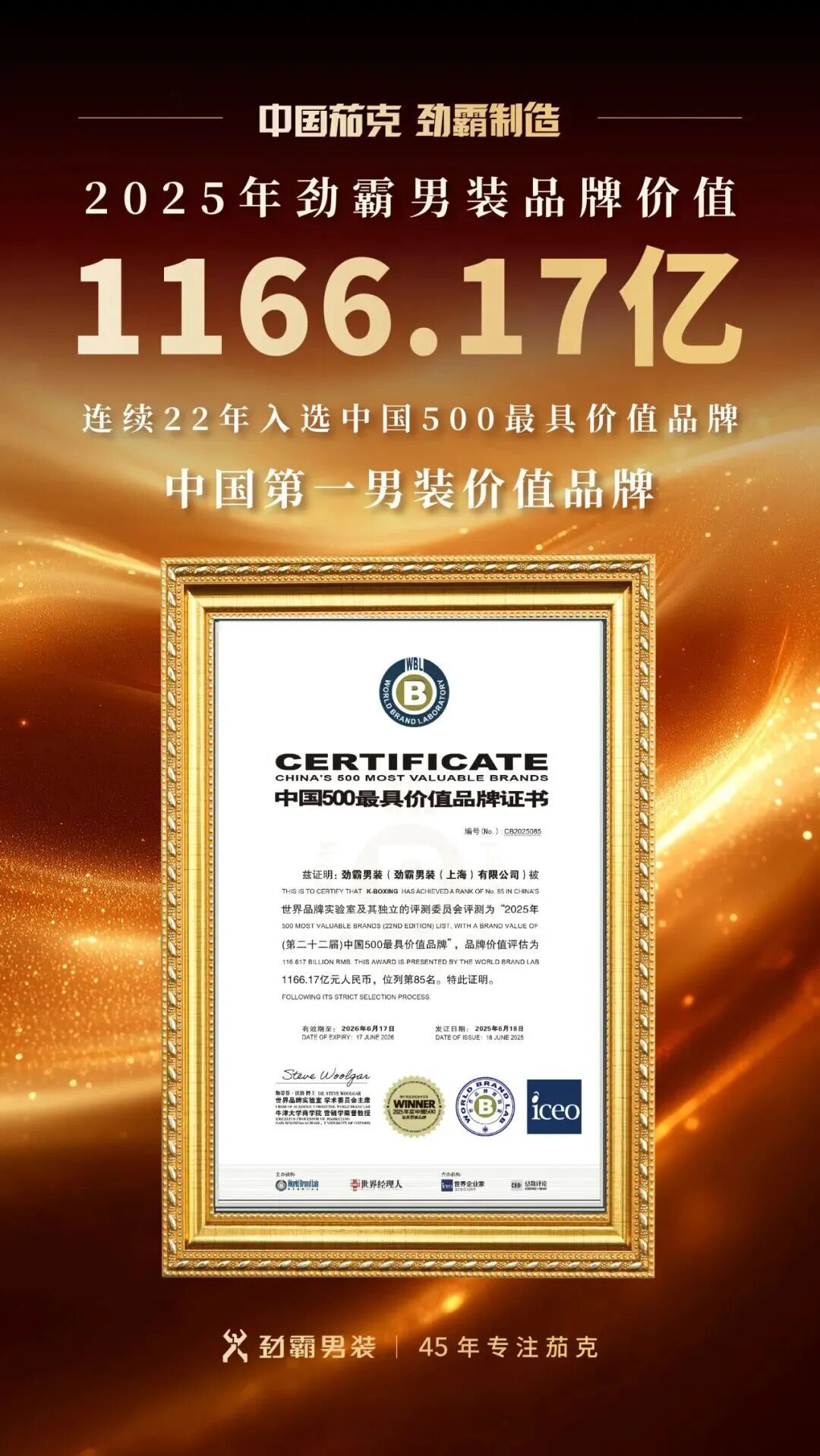 在洪锽淮的带领下,劲霸的品牌价值持续攀升,2025年达到1166.17亿元,连续22年蝉联中国500最具价值品牌榜,稳居中国男装第一价值品牌。这份成绩的背后,是他对“守正”与“创新”的精准把握——守的是劲霸45年专注茄克的匠心、实业报国的家国情怀;创的是东方美学的当代表达、品牌战略的国际化升级、可持续发展的商业模式。