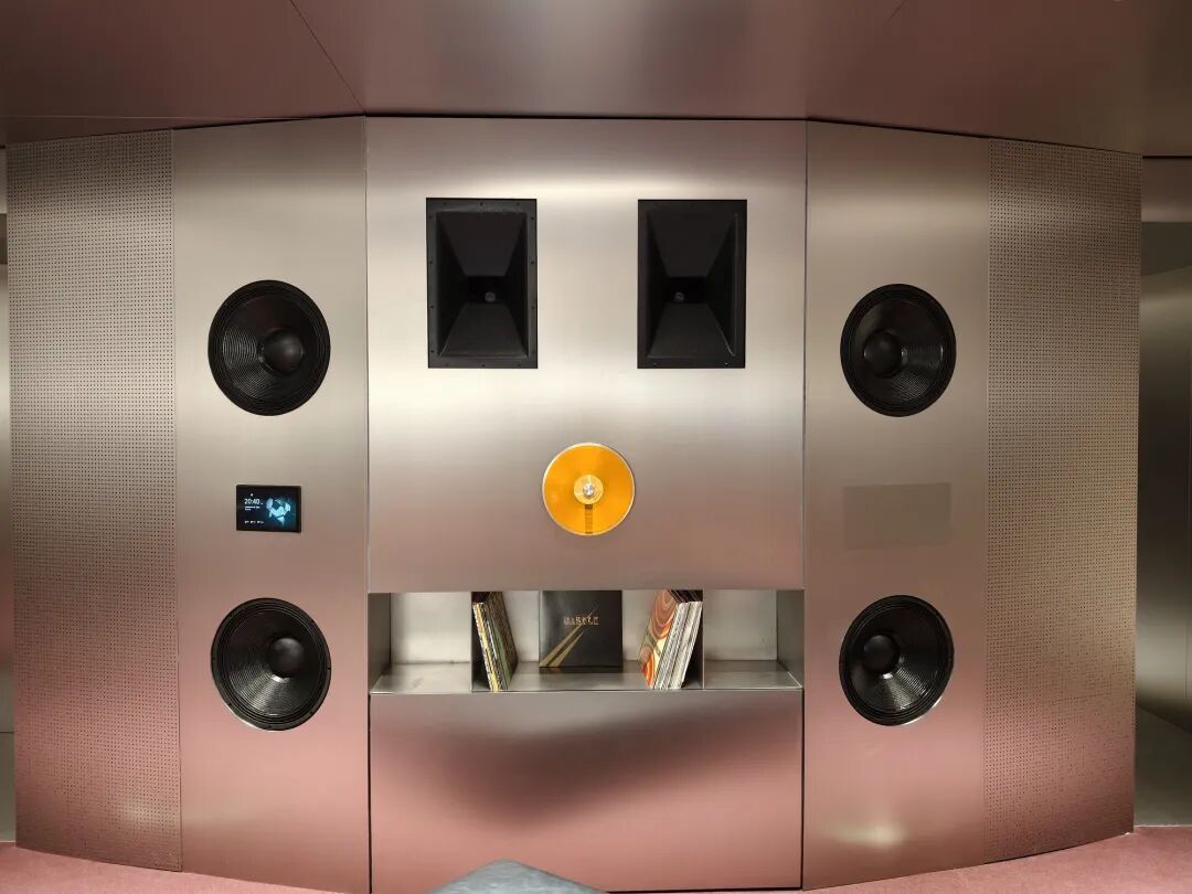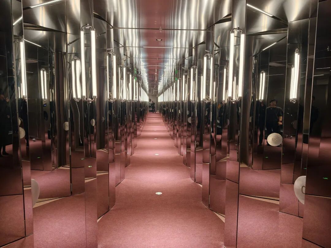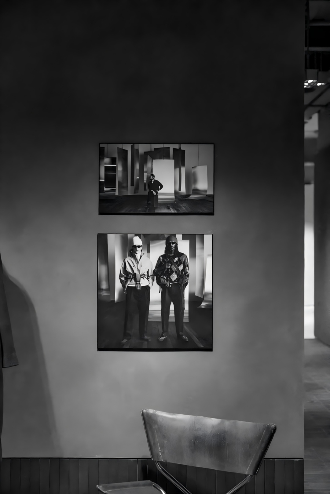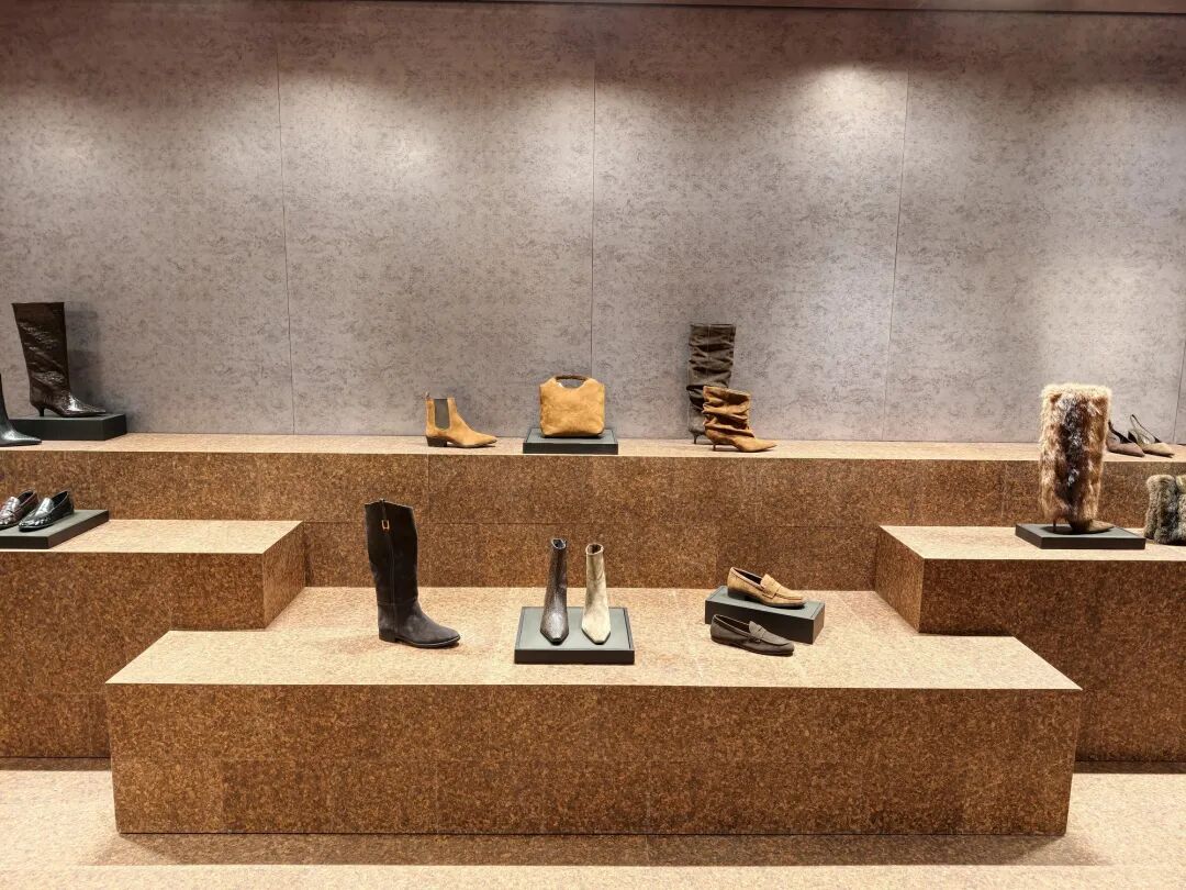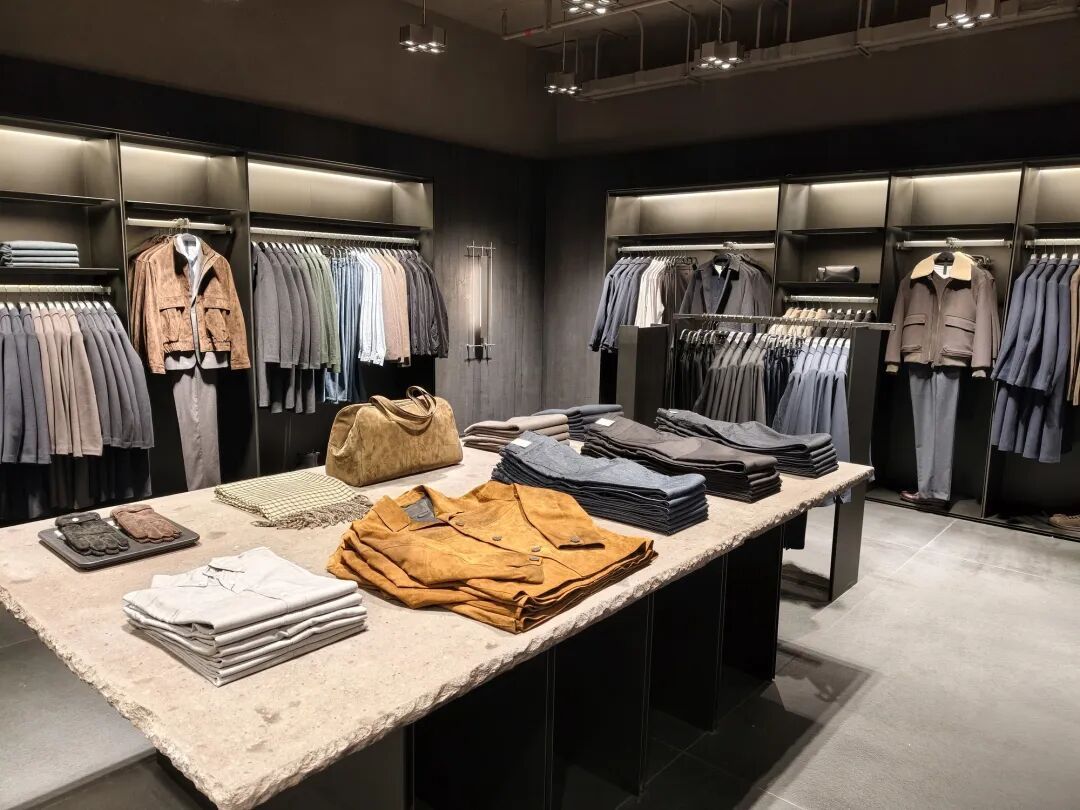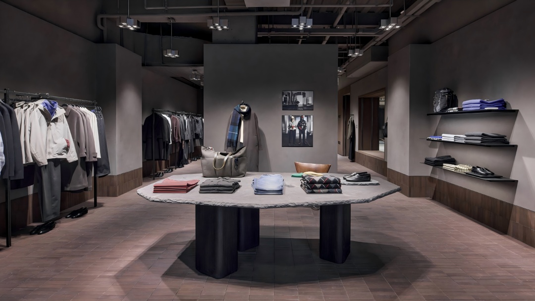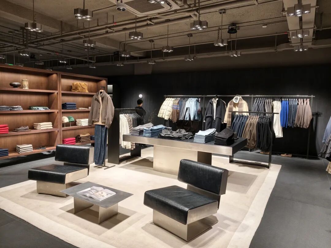 与此形成对比的是年轻女装系列专属区域——不锈钢元素、流线型轮廓与特色家具共同勾勒出该系列的独特风格。男装系列则呈现出更为精致的场景,深色基调辅以不锈钢细节与木纹饰面,营造沉稳氛围。
