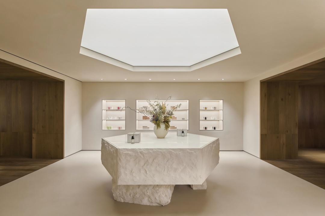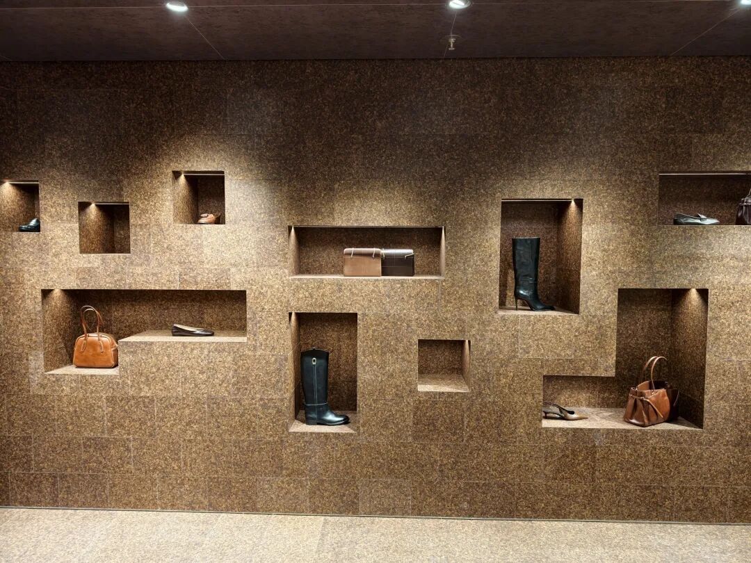 步入店内空间,感官细节处处可见:工业质感的墙面,融入木材、天然织物与多样的肌理元素、软木元素作为自然材质点缀其间,同时中性及大地色系构成主色调,配合层次丰富的灯光效果。