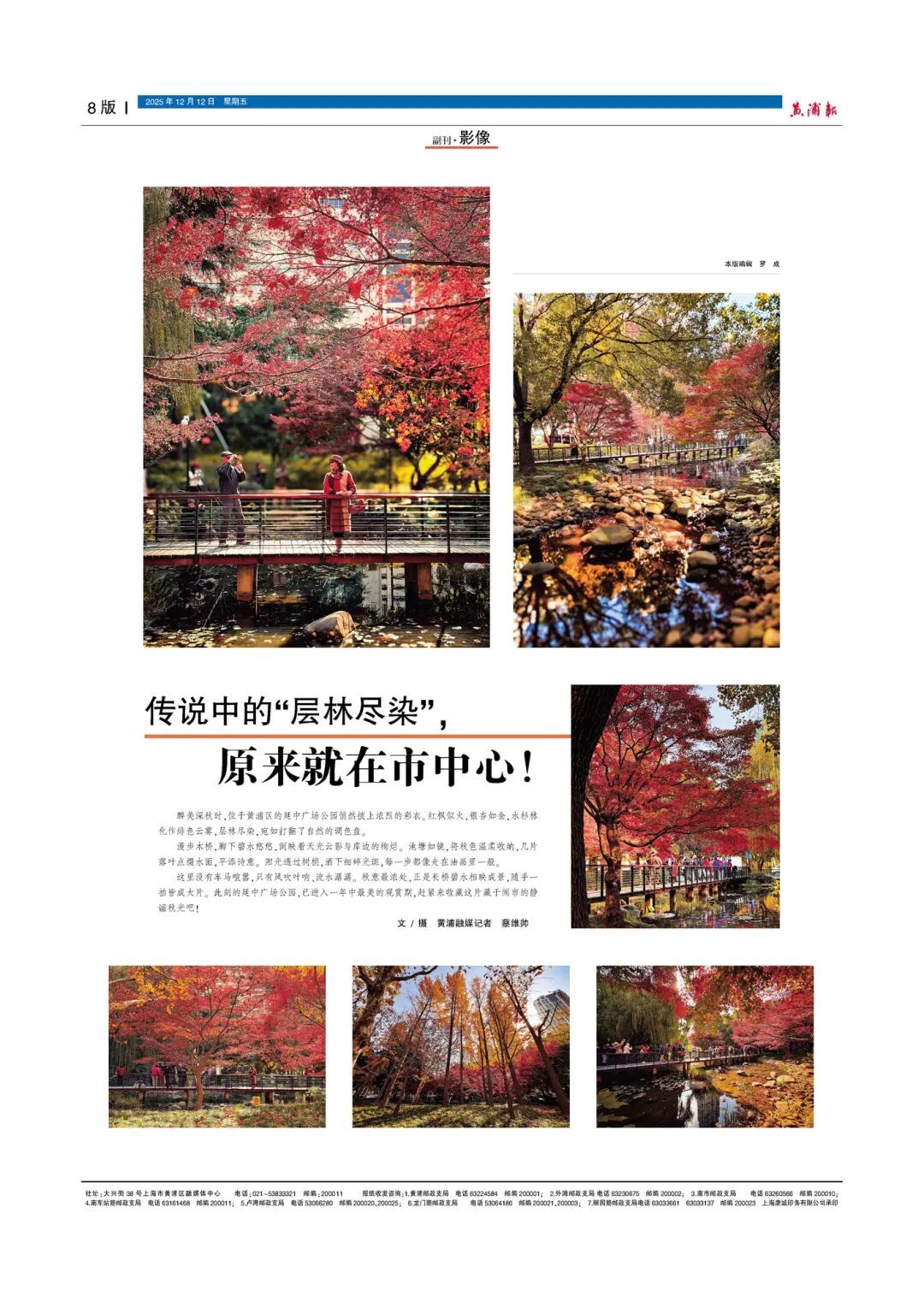 醉美深秋时。位于黄浦区的延中广场公园悄然披上浓烈的彩衣。红枫似火,银杏如金,水杉林化作绯色云雾,层林尽染,宛如打翻了自然的调色盘。