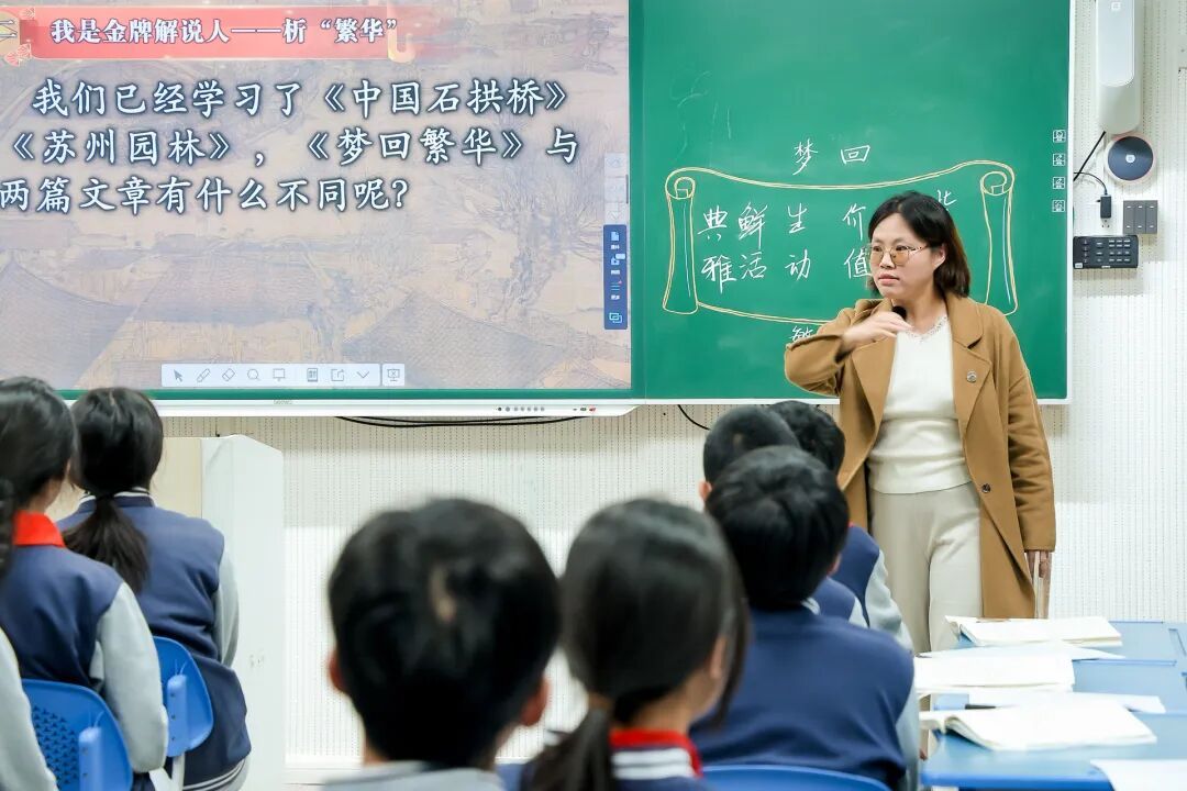 类似的真实情境贯穿各个学科。四年级英语课变身“我爱我校”项目发布会,学生融合美术、音乐等元素,用海报、AI创编歌曲表达对校园的爱;八年级语文课《梦回繁华》中,学生化身“国宝守护人”,深度解码《清明上河图》背后的繁华与深意。