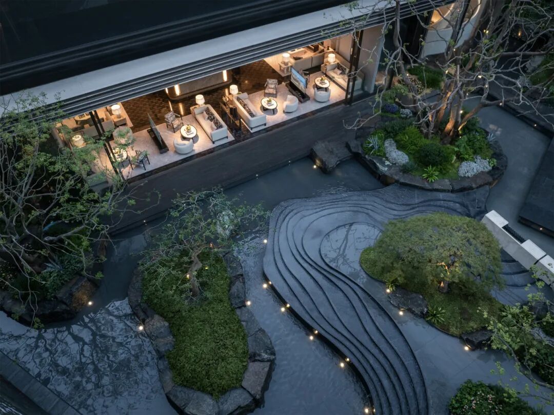 社区规划打破传统边界,实现了从归家动线到生活场景的定制。酒店式门头设计巧妙构建了从都市喧嚣到静谧家园的场景转换。社区中央规划下沉式立体庭院,借鉴传统石库门肌理,融合溪谷、密林、叠瀑等自然元素,创造出层次丰富的沉浸式园林。五栋高层的首层设计为架空泛会所空间,未来可规划为书吧、健身区等多功能社交场所。