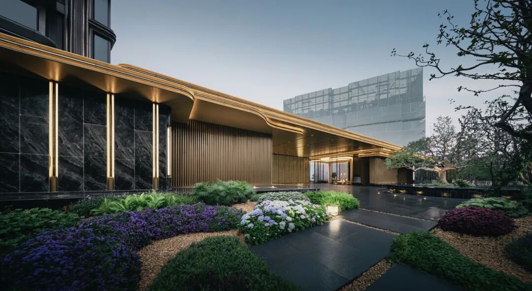 整体延续现代极简风格的内核,迭新传统的建筑色彩搭配,形成自然咖色与城市鎏金的视觉碰撞,极富识别度的立面腔调,传递传统建筑的时尚韵味。并将陶艺创作铺陈于立面,双曲弯弧形璞釉陶与双曲铝板,让自然咖色与城市鎏金交织碰撞,在经典三段式的背景中,筑造艺术立面。