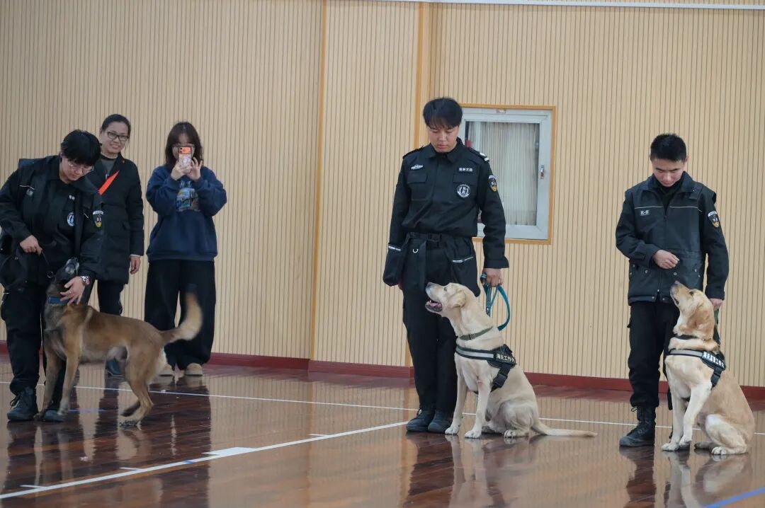 最令人期待的当属监管犬搜查演示环节,在学校运动场馆,训导员首先带来了监管犬“六六”的服从科目表演,引得同学们目不转睛。随着训导员口令下达,“六六”精准完成行进间坐、卧、立等动作,步伐与指令完美同步;随后,搜爆、搜毒演示接续展开,训导员还邀请同学们,提前在行李箱内隐蔽放置了水果、蔬菜、肉制品等样品。随着训导员一声令下,“波比”迅速登场,只见它耳朵竖起、鼻尖微动,在各类物品间灵活穿梭,短短几十秒便精准定位到目标物品,随后停下并做出示警动作,引得现场同学纷纷鼓掌叫好。紧接着,“土豆”也准确完成了动态箱包搜钞任务,它们专业、严谨的表现让同学们深刻感受到了海关监管犬的“硬核实力”。