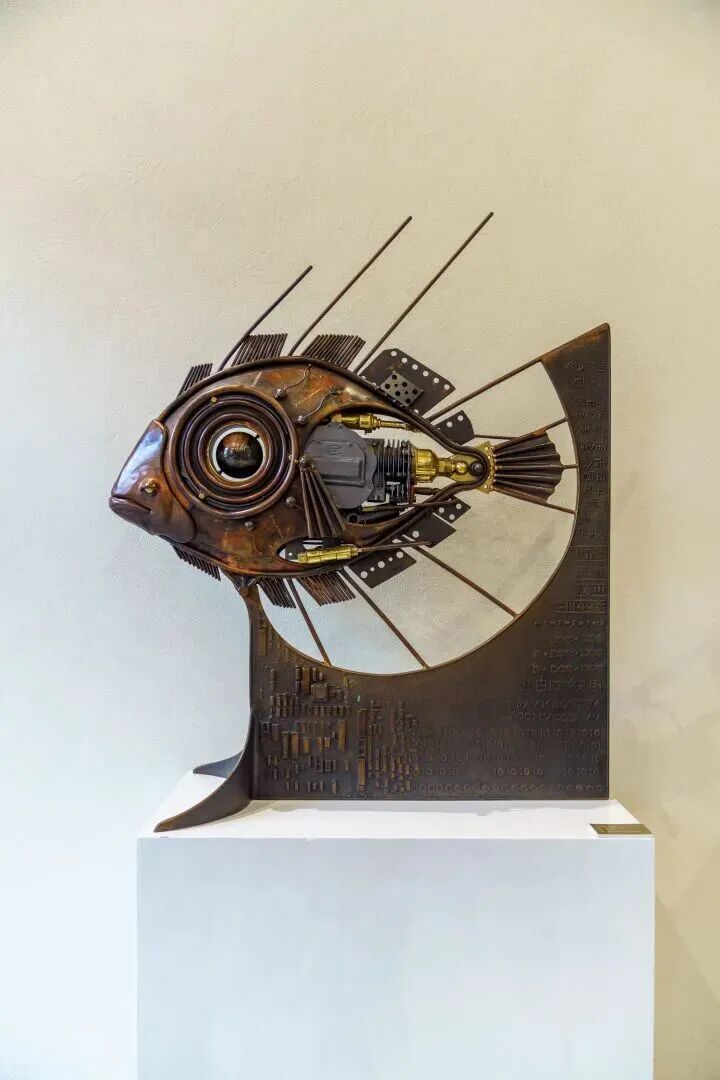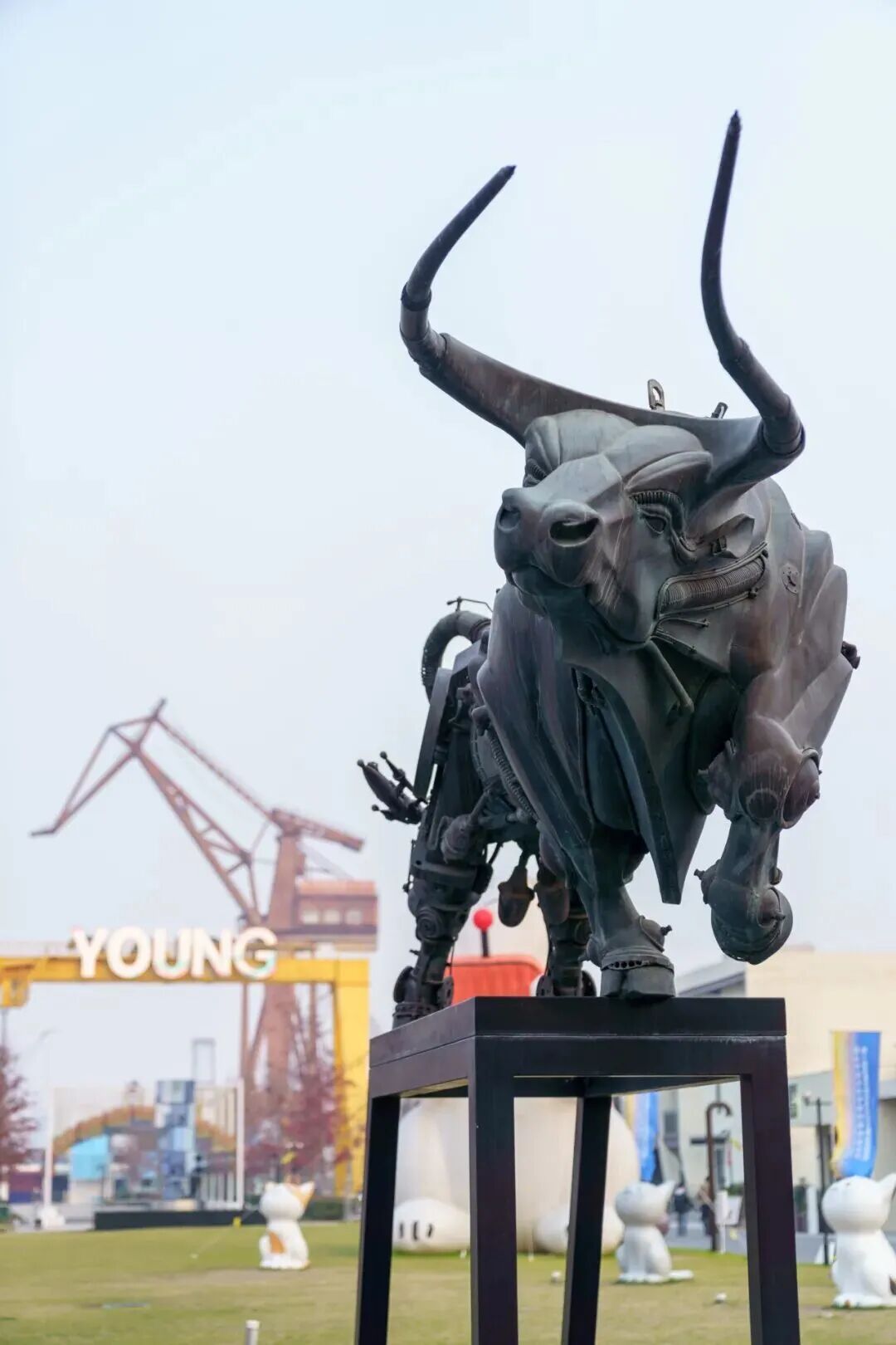 作品以腾跃的牛为形象,象征上海的蓬勃发展与腾飞精神。雕塑融合机械零部件与多种金属材质,体现艺术家对科技与人文结合的探索。